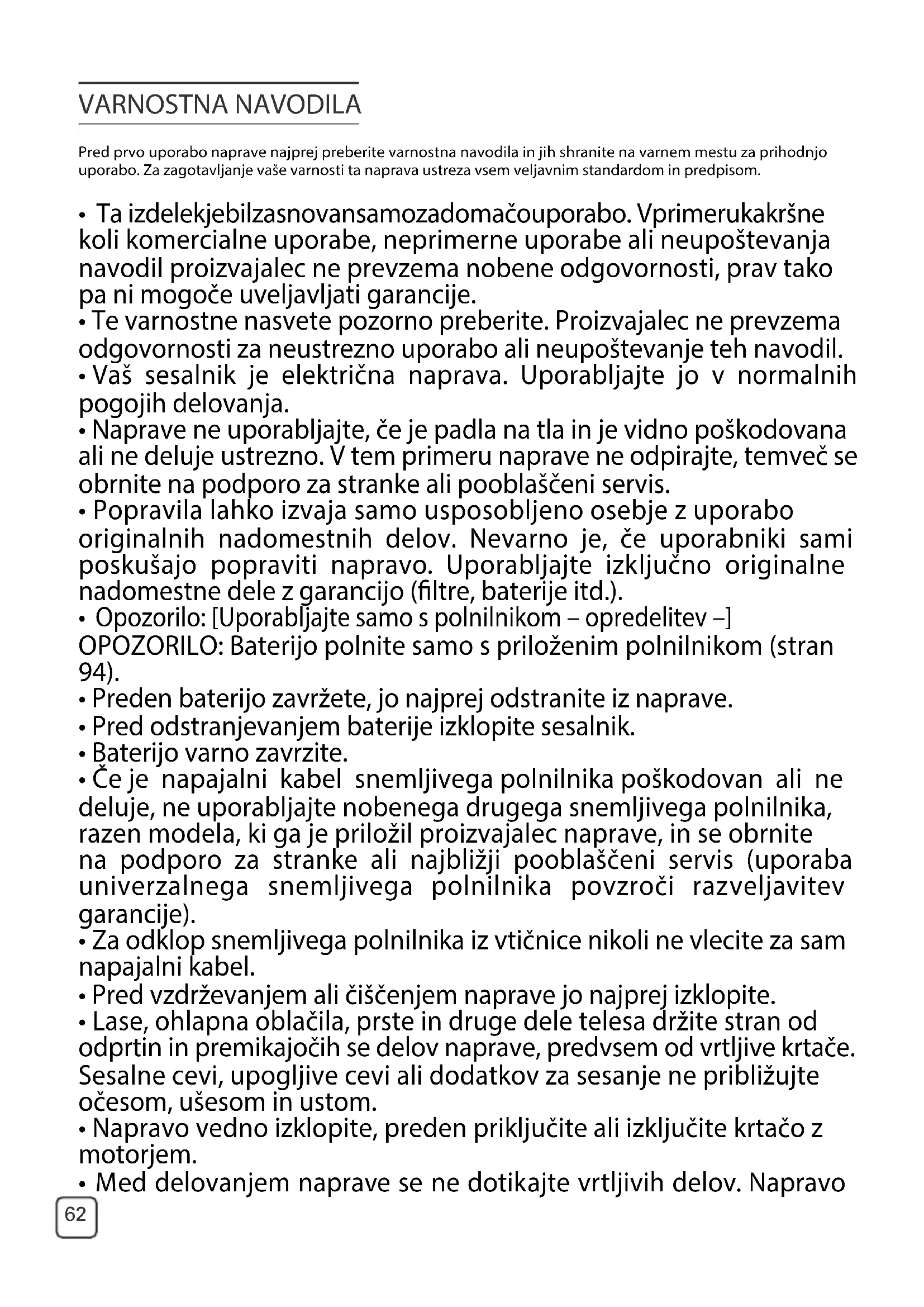 - Te varnostne nasvete pozorno preberite. Proizvajalec ne prevzema odgovornosti za neustrezno uporabo ali neupoštevanje teh navodil.