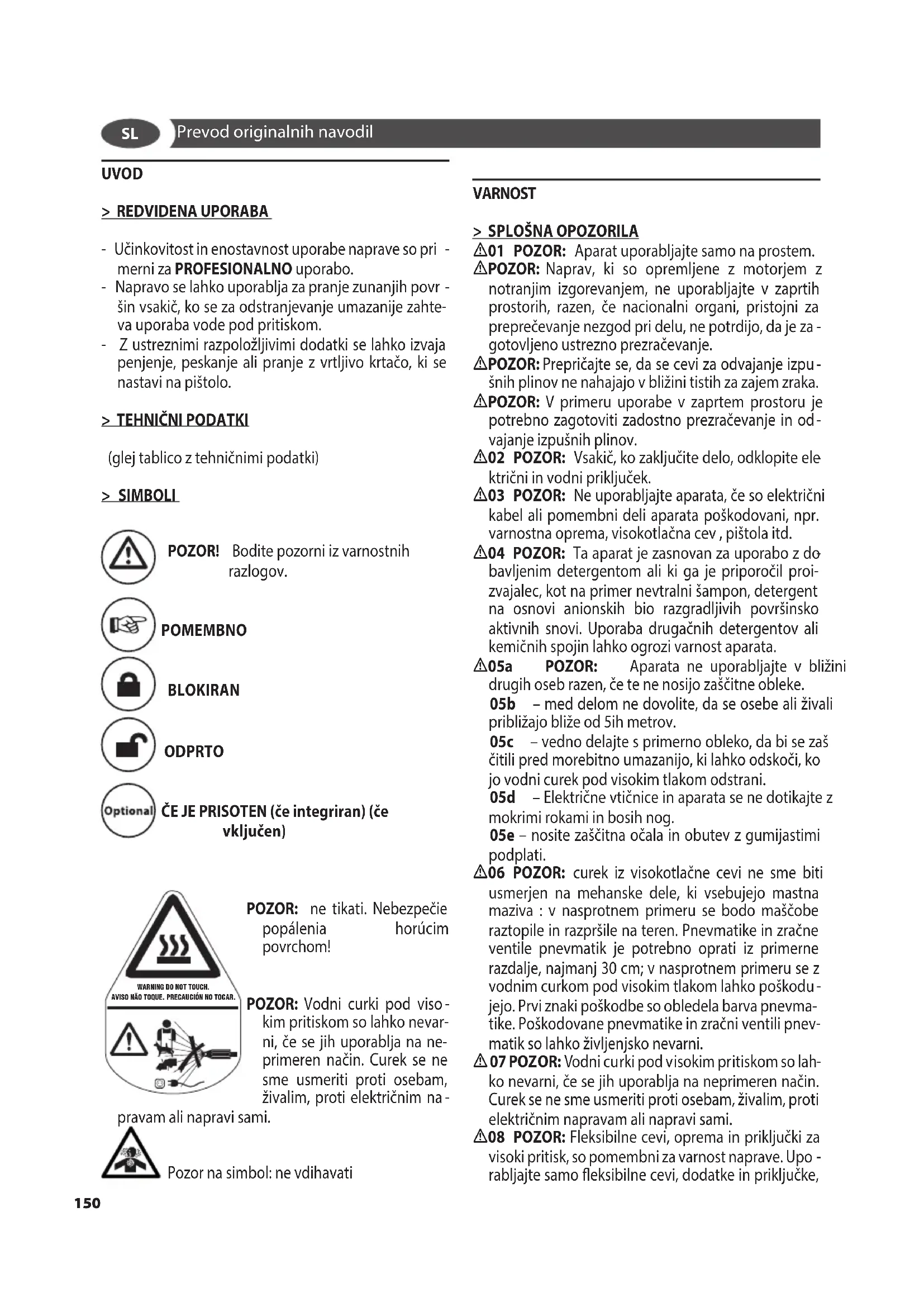 čitili pred morebitno umazanijo, ki lahko odskoči, ko jo vodni curek pod visokim tlakom odstrani. 05d – Električne vtičnice in aparata se ne dotikajte z mokrimi rokami in bosih nog. 05e – nosite zaščitna očala in obutev z gumijastimi podplati.