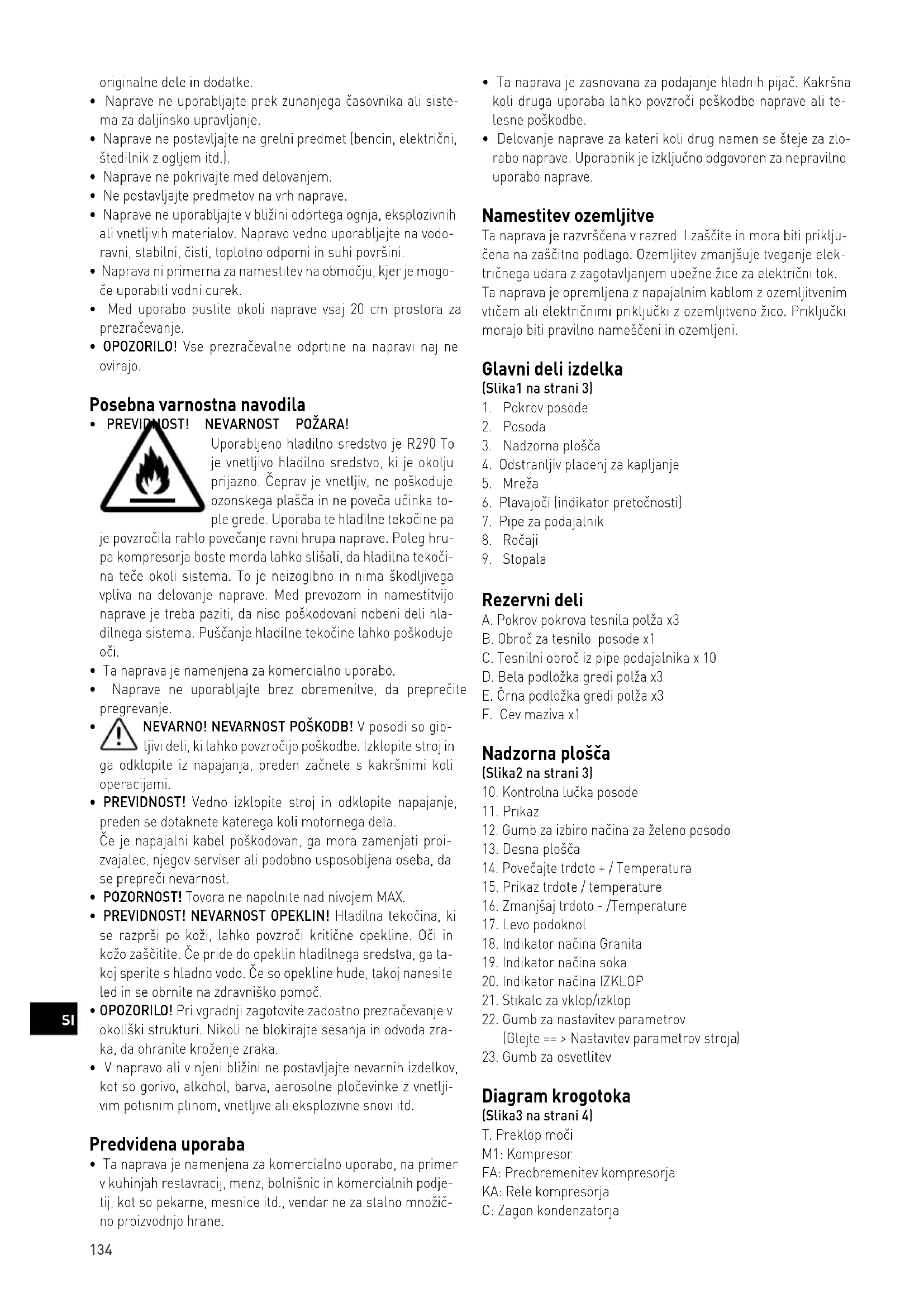 - PREVIDNOST! NEVARNOST POŽARA! Uporabljeno hladilno sredstvo je R290 To je vnetljivo hladilno sredstvo, ki je okolju prijazno. Čeprav je vnetljiv, ne poškoduje ozonskega plašča in ne poveča učinka to- ple grede. Uporaba te hladilne tekočine pa je povzročila rahlo povečanje ravni hrupa naprave. Poleg hru- pa kompresorja boste morda lahko slišali, da hladilna tekoči- na teče okoli sistema. To je neizogibno in nima škodljivega vpliva na delovanje naprave. Med prevozom in namestitvijo naprave je treba paziti, da niso poškodovani nobeni deli hla- dilnega sistema. Puščanje hladilne tekočine lahko poškoduje oči.