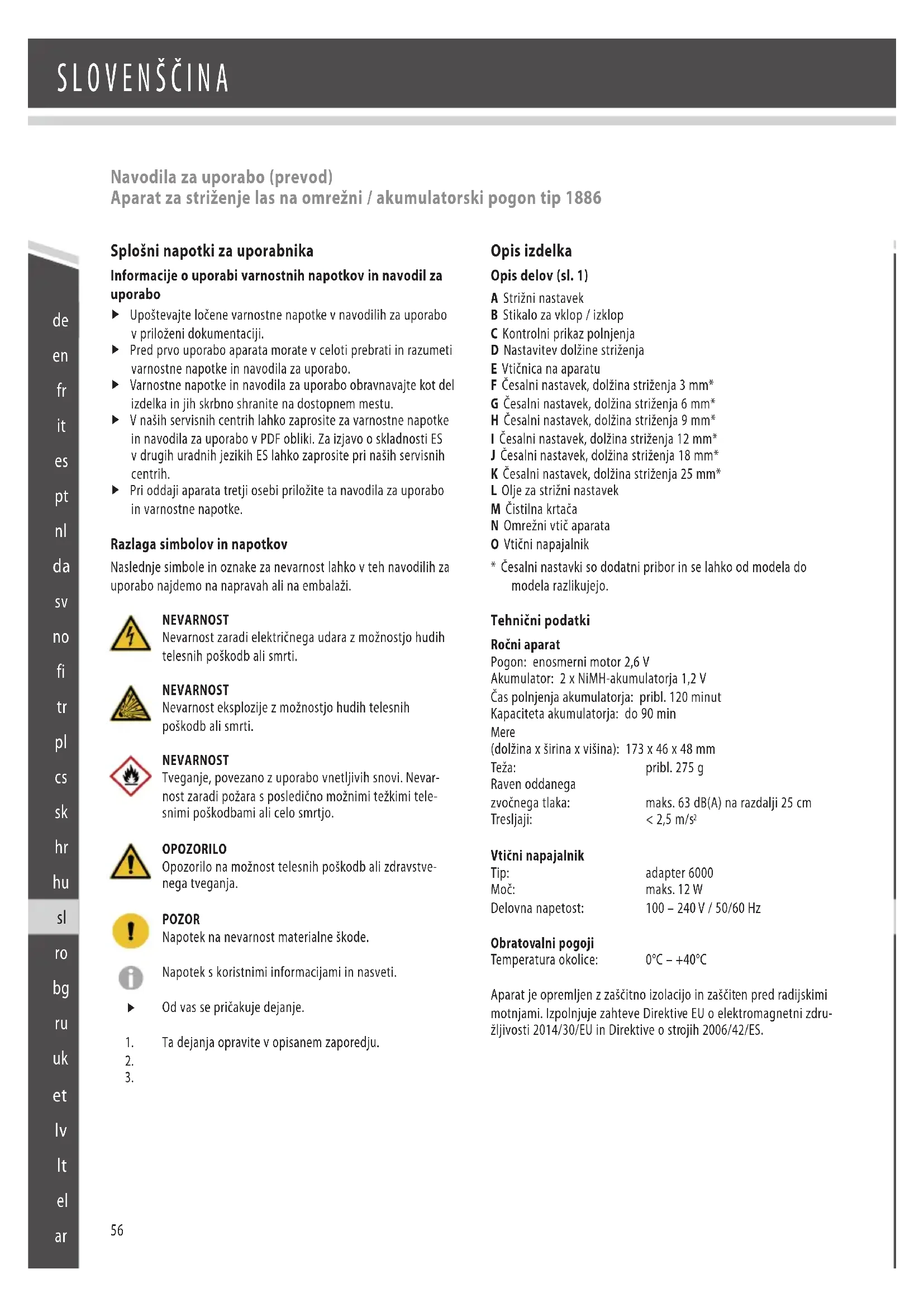 Navodila za uporabo (prevod) Aparat za striženje las na omrežni / akumulatorski pogon tip 1886 Splošni napotki za uporabnika Informacije o uporabi varnostnih napotkov in navodil za uporabo f Upoštevajte ločene varnostne napotke v navodilih za uporabo v priloženi dokumentaciji. f Pred prvo uporabo aparata morate v celoti prebrati in razumeti varnostne napotke in navodila za uporabo. f Varnostne napotke in navodila za uporabo obravnavajte kot del izdelka in jih skrbno shranite na dostopnem mestu. f V naših servisnih centrih lahko zaprosite za varnostne napotke in navodila za uporabo v PDF obliki. Za izjavo o skladnosti ES v drugih uradnih jezikih ES lahko zaprosite pri naših servisnih centrih. f Pri oddaji aparata tretji osebi priložite ta navodila za uporabo in varnostne napotke. Razlaga simbolov in napotkov Naslednje simbole in oznake za nevarnost lahko v teh navodilih za uporabo najdemo na napravah ali na embalaži. NEVARNOST Nevarnost zaradi električnega udara z možnostjo hudih telesnih poškodb ali smrti. NEVARNOST Nevarnost eksplozije z možnostjo hudih telesnih poškodb ali smrti. NEVARNOST Tveganje, povezano z uporabo vnetljivih snovi. Nevar- nost zaradi požara s posledično možnimi težkimi tele- snimi poškodbami ali celo smrtjo. OPOZORILO Opozorilo na možnost telesnih poškodb ali zdravstve- nega tveganja. POZOR Napotek na nevarnost materialne škode. Napotek s koristnimi informacijami in nasveti. Od vas se pričakuje dejanje. Ta dejanja opravite v opisanem zaporedju.