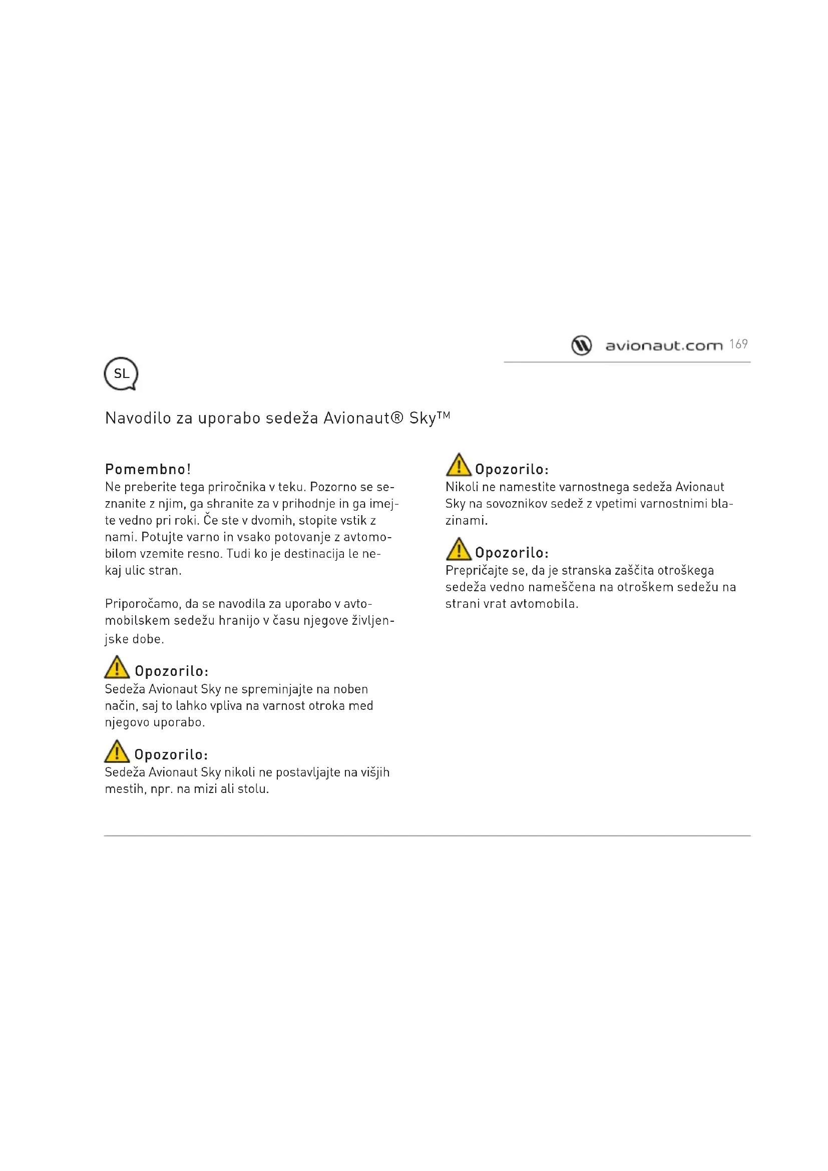 - Tato záruka bola pripravená firmou KARVALA zaregistrovanou v Poľsku. Adresa firmy je: KARWALA Szarlejka, ul. Lukaszewicza 172 42-130 Wreczyca Wielka, Polska (1) Zakúpené výrobky sodstránenými alebo zmenenými etiketami alebo identifikačnými číslami sú považované za neautorizované. V súvislosti s tým, že autenticita takých výrobkov sa nedá určiť, záruka sa na nich nevzťahuje. 168Pomembno! Ne preberite tega priročnika v teku. Pozorno se se- znanite z njim, ga shranite za v prihodnje in ga imej- te vedno pri roki. Če ste v dvomih, stopite vstik z nami. Potujte varno in vsako potovanje z avtomo- bilom vzemite resno. Tudi ko je destinacija le ne- kaj ulic stran. Priporočamo, da se navodila za uporabo v avto- mobilskem sedežu hranijo v času njegove življen- jske dobe. Opozorilo: Sedeža Avionaut Sky ne spreminjajte na noben način, saj to lahko vpliva na varnost otroka med njegovo uporabo. Opozorilo: Sedeža Avionaut Sky nikoli ne postavljajte na višjih mestih, npr. na mizi ali stolu. Navodilo za uporabo sedeža Avionaut® Sky™ Opozorilo: Nikoli ne namestite varnostnega sedeža Avionaut Sky na sovoznikov sedež z vpetimi varnostnimi bla- zinami. Opozorilo: Prepričajte se, da je stranska zaščita otroškega sedeža vedno nameščena na otroškem sedežu na strani vrat avtomobila.