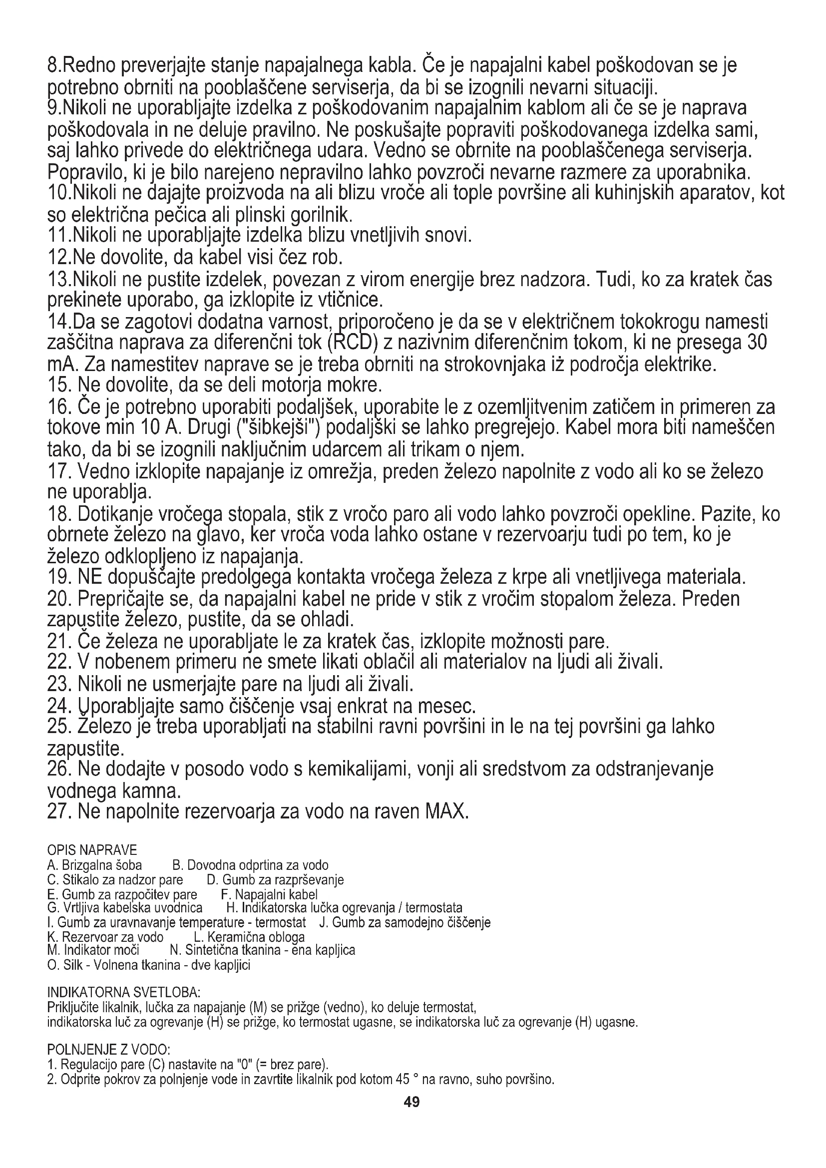 obrnete železo na glavo, ker vroča voda lahko ostane v rezervoarju tudi po tem, ko je železo odklopljeno iz napajanja. 8.Redno preverjajte stanje napajalnega kabla. Če je napajalni kabel poškodovan se je potrebno obrniti na pooblaščene serviserja, da bi se izognili nevarni situaciji. 9.Nikoli ne uporabljajte izdelka z poškodovanim napajalnim kablom ali če se je naprava poškodovala in ne deluje pravilno. Ne poskušajte popraviti poškodovanega izdelka sami, saj lahko privede do električnega udara. Vedno se obrnite na pooblaščenega serviserja. Popravilo, ki je bilo narejeno nepravilno lahko povzroči nevarne razmere za uporabnika. E. Gumb za razpočitev pare F. Napajalni kabel