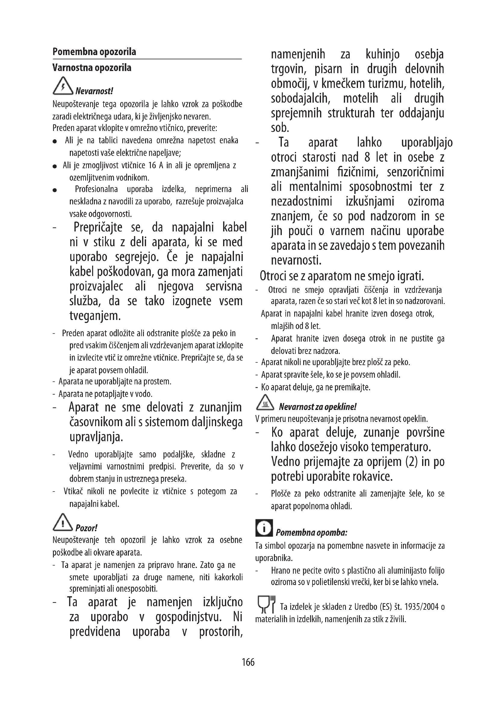DOSER FOR: 8-10 vaer TILBEREDNING: 10min TILBEREDNINGSTID: 15min INGREDIENSER: - 2 kopper / 460g mel - 1 teskje salt - 1 teskje / 3g bakepulver - 170 g sukker - 2 egg - 1 og 1/2 kopp / 345 ml lunken melk - 80 g smør - 1 teskje vanlijeekstrakt - 140 g kokesjokolade - 60 g kakaopulver - 6 g kanel TILBEREDNING: Sett sjokoladen og smører i en bolle som tåler mikrobølgeovn og varm ved maksimal styrke i 30 sekunder. Bland til sjokoladen og smøret er helt smeltet og blandingen er glatt. La avkjøle litt. Bland eggene, melken og vaniljen med en visp i en stor bolle og bland dette godt inn i smøret og sjokoladen. Sikt mel, sukker, kakaopulver, kanel, bakepulver og salt sammen i en romslig bolle. Tilsett melblandingen og de andre ingrediensene i eggene og bland alt med en visp til blandingen er glatt nok. Forvarm platene for vaer. Når meldingen ready dukker opp på displayet smører du platene eller bruker en smørespray, og heller deretter et mål røre i hver av formene i platen, bruk om nødvendig også en teskje, spre røren utover med en spatel. Stek vaene til de er gylne og sprø. Fortsett til du har brukt opp røren. Server umiddelbart.166 Pomembna opozorila Varnostna opozorila Nevarnost! Neupoštevanje tega opozorila je lahko vzrok za poškodbe zaradi električnega udara, ki je življenjsko nevaren. Preden aparat vklopite v omrežno vtičnico, preverite: ● Ali je na tablici navedena omrežna napetost enaka napetosti vaše električne napeljave; ● Ali je zmogljivost vtičnice 16 A in ali je opremljena z ozemljitvenim vodnikom. ● Profesionalna uporaba izdelka, neprimerna ali neskladna z navodili za uporabo, razrešuje proizvajalca vsake odgovornosti. - Prepričajte se, da napajalni kabel ni v stiku z deli aparata, ki se med uporabo segrejejo. Če je napajalni kabel poškodovan, ga mora zamenjati proizvajalec ali njegova servisna služba, da se tako izognete vsem tveganjem. - Preden aparat odložite ali odstranite plošče za peko in pred vsakim čiščenjem ali vzdrževanjem aparat izklopite in izvlecite vtič iz omrežne vtičnice. Prepričajte se, da se je aparat povsem ohladil. - Aparata ne uporabljajte na prostem. - Aparata ne potapljajte v vodo. - Aparat ne sme delovati z zunanjim časovnikom ali s sistemom daljinskega upravljanja. - Vedno uporabljajte samo podaljške, skladne z veljavnimi varnostnimi predpisi. Preverite, da so v dobrem stanju in ustreznega preseka. - Vtikač nikoli ne povlecite iz vtičnice s potegom za napajalni kabel. Pozor! Neupoštevanje teh opozoril je lahko vzrok za osebne poškodbe ali okvare aparata. - Ta aparat je namenjen za pripravo hrane. Zato ga ne smete uporabljati za druge namene, niti kakorkoli spreminjati ali onesposobiti. - Ta aparat je namenjen izključno za uporabo v gospodinjstvu. Ni predvidena uporaba v prostorih, namenjenih za kuhinjo osebja trgovin, pisarn in drugih delovnih območij, v kmečkem turizmu, hotelih, sobodajalcih, motelih ali drugih sprejemnih strukturah ter oddajanju sob. - Ta aparat lahko uporabljajo otroci starosti nad 8 let in osebe z zmanjšanimi zičnimi, senzoričnimi ali mentalnimi sposobnostmi ter z nezadostnimi izkušnjami oziroma znanjem, če so pod nadzorom in se jih pouči o varnem načinu uporabe aparata in se zavedajo s tem povezanih nevarnosti. Otroci se z aparatom ne smejo igrati. - Otroci ne smejo opravljati čiščenja in vzdrževanja aparata, razen če so stari več kot 8 let in so nadzorovani. Aparat in napajalni kabel hranite izven dosega otrok, mlajših od 8 let. - Aparat hranite izven dosega otrok in ne pustite ga delovati brez nadzora. - Aparat nikoli ne uporabljajte brez plošč za peko. - Aparat spravite šele, ko se je povsem ohladil. - Ko aparat deluje, ga ne premikajte. Nevarnost za opekline! V primeru neupoštevanja je prisotna nevarnost opeklin. - Ko aparat deluje, zunanje površine lahko dosežejo visoko temperaturo. Vedno prijemajte za oprijem (2) in po potrebi uporabite rokavice. - Plošče za peko odstranite ali zamenjajte šele, ko se aparat popolnoma ohladi. Pomembna opomba: Ta simbol opozarja na pomembne nasvete in informacije za uporabnika. - Hrano ne pecite ovito s plastično ali aluminijasto folijo oziroma so v polietilenski vrečki, ker bi se lahko vnela. Ta izdelek je skladen z Uredbo (ES) št. 1935/2004 o materialih in izdelkih, namenjenih za stik z živili.167 Odstranitev aparata Aparata ne smete odstraniti skupaj z gospodinjskimi odpadki, izročite ga pooblaščenemu centru za ločeno zbiranje odpadkov. OPIS
