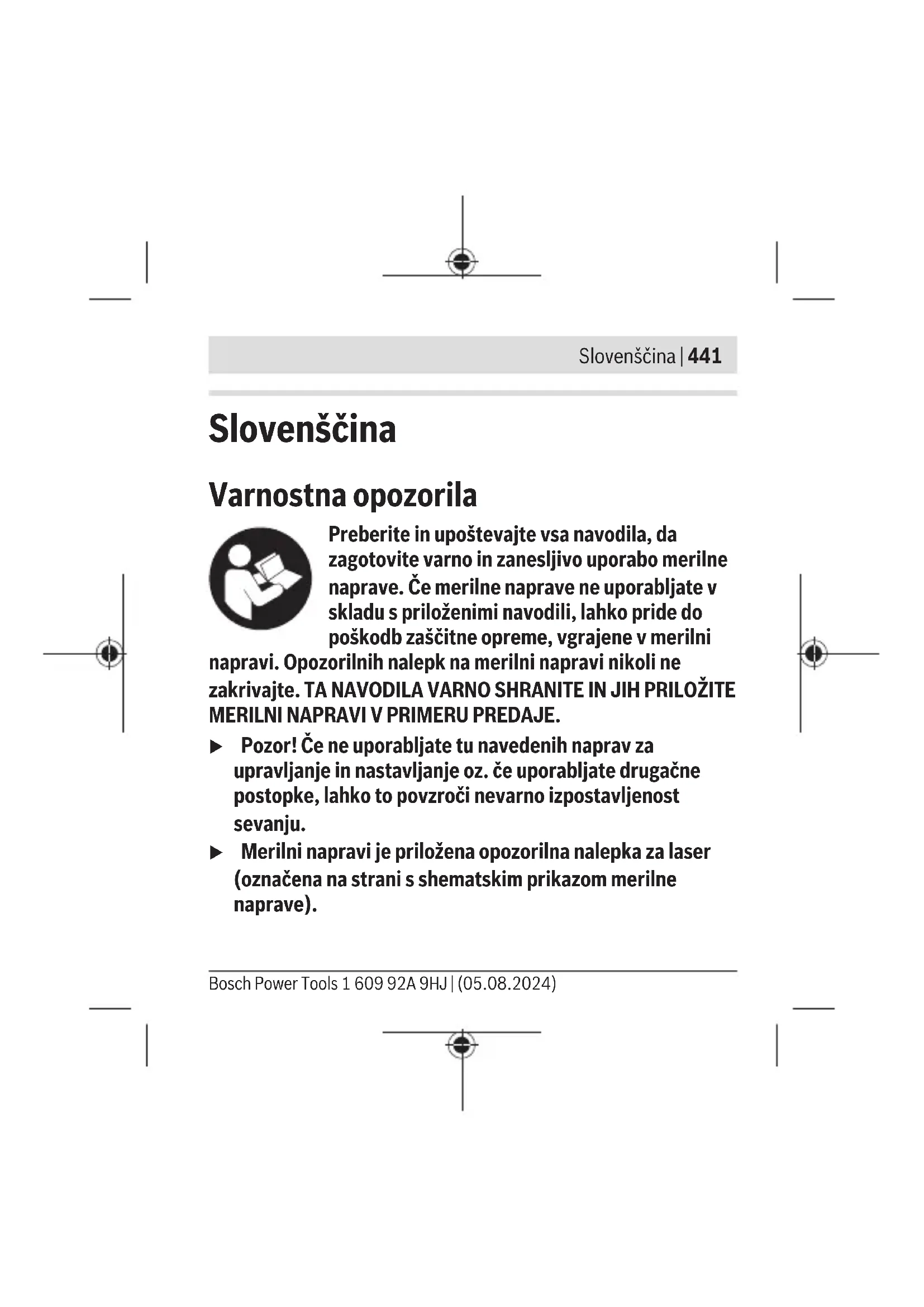 i na: www.bosch-pt.com/serviceaddresses Uklanjanje đubreta Merne alate, akumulatore/baterije, pribor i pakovanja treba predati na reciklažu koja je u skladu sa zaštitom životne sredine. Bosch Power Tools 1 609 92A 9HJ | (05.08.2024)440 | Srpski Merne alate i akumulatorske baterije/baterije nemojte bacati u kućni otpad! Samo za EU‑zemlje: Merni alati koji se više ne mogu koristiti i neispravni ili istrošeni akumulatori/baterije moraju da se odlažu u otpad odvojeno. Koristite predviđene sisteme za sakupljanje. Ako se nepravilno zbrine, otpadna električna i elektronska oprema može imati štetne posledice po životnu sredinu i zdravlje ljudi zbog moguceg prisustva opasnih materija. 1 609 92A 9HJ | (05.08.2024) Bosch Power ToolsSlovenščina | 441 Slovenščina Varnostna opozorila Preberite in upoštevajte vsa navodila, da zagotovite varno in zanesljivo uporabo merilne naprave. Če merilne naprave ne uporabljate v skladu s priloženimi navodili, lahko pride do poškodb zaščitne opreme, vgrajene v merilni napravi. Opozorilnih nalepk na merilni napravi nikoli ne zakrivajte. TA NAVODILA VARNO SHRANITE IN JIH PRILOŽITE MERILNI NAPRAVI V PRIMERU PREDAJE. u Pozor! Če ne uporabljate tu navedenih naprav za upravljanje in nastavljanje oz. če uporabljate drugačne postopke, lahko to povzroči nevarno izpostavljenost sevanju. u Merilni napravi je priložena opozorilna nalepka za laser (označena na strani s shematskim prikazom merilne naprave). Bosch Power Tools 1 609 92A 9HJ | (05.08.2024)442 | Slovenščina u Če besedilo na varnostni nalepki za laser ni v vašem jeziku, ga pred prvim zagonom prelepite s priloženo nalepko v ustreznem jeziku. Laserskega žarka ne usmerjajte v osebe ali živali in tudi sami ne glejte neposredno v laserski žarek ali njegov odsev. S tem lahko zaslepite ljudi in povzročite nesrečo ali poškodbe oči. u Če laserski žarek usmerite v oči, jih zaprite in glavo takoj obrnite stran od žarka. u Ne spreminjajte laserske naprave. u Očal za opazovanje laserskega žarka (dodatna oprema) ne uporabljajte kot zaščitna očala. Očala za opazovanje laserskega žarka so namenjena boljšemu zaznavanju laserskega žarka. Ne nudijo zaščite pred laserskimi žarki. u Očal za opazovanje laserskega žarka (dodatna oprema) ne uporabljajte kot sončna očala v prometu. Očala za opazovanje laserskega žarka ne omogočajo popolne UV- zaščite, obenem pa zmanjšujejo zaznavanje barv. u Merilno napravo lahko popravlja samo usposobljeno strokovno osebje z originalnimi nadomestnimi deli. Na ta način bo ohranjena varnost merilne naprave. 1 609 92A 9HJ | (05.08.2024) Bosch Power ToolsSlovenščina | 443 u Otroci laserske merilne naprave ne smejo uporabljati brez nadzora. Pomotoma bi lahko zaslepili sebe ali druge. u Z merilno napravo ne smete delati v okolju, kjer je prisotna nevarnost eksplozije in v katerem so prisotne gorljive tekočine, plini ali prah. V merilni napravi lahko nastanejo iskre, ki lahko vnamejo prah ali hlape. Magneta ne približujte vsadkom in drugim zdravstvenim napravam, npr. srčnim spodbujevalnikom ali inzulinskim črpalkam. Magnetustvari magnetno polje, ki lahko vpliva na delovanje vsadkov ali zdravstvenih naprav. u Merilna naprava ne sme biti v bližini magnetnih nosilcev podatkov in naprav, ki so občutljive na delovanje magneta. Zaradi magnetnih vplivov lahko pride do nepopravljivih izgub podatkov. Opis izdelka in storitev Prosimo upoštevajte slike na sprednjem delu navodila za obratovanje. Bosch Power Tools 1 609 92A 9HJ | (05.08.2024)444 | Slovenščina Namenska uporaba Merilna naprava je predvidena za določanje in preverjanje vodoravnih in navpičnih linij. Merilno orodje je primerno za uporabo v notranjih prostorih. Za izdelek je laserski izdelek, namenjen potrošnikom, v skladu s standardom EN50689. Komponente na sliki Oštevilčenje naslikanih komponent se nanaša na prikaz merilne naprave na strani s shemami. (1) Izstopna odprtina za laserski žarek v linijskem načinu (2) Stikalo za vklop/izklop z izbiro načina delovanja (3) Oznaka položaja (4) Vodna tehtnica za vodoravno poravnavanje (5) Vodna tehtnica za navpično poravnavanje (6) Izstopna odprtina za laserski žarek v točkovnem načinu (7) Zapah pokrova predala za baterije (8) Pokrov predala za baterije 1 609 92A 9HJ | (05.08.2024) Bosch Power ToolsSlovenščina | 445 (9) Magnet (10) Opozorilna ploščica laserja (11) Serijska številka (12) Naležna površina (aluminij) (13) Držalo (14) Vrtljiva ploščica držala (15) Magnetno vpetje držala (16) Stojalo