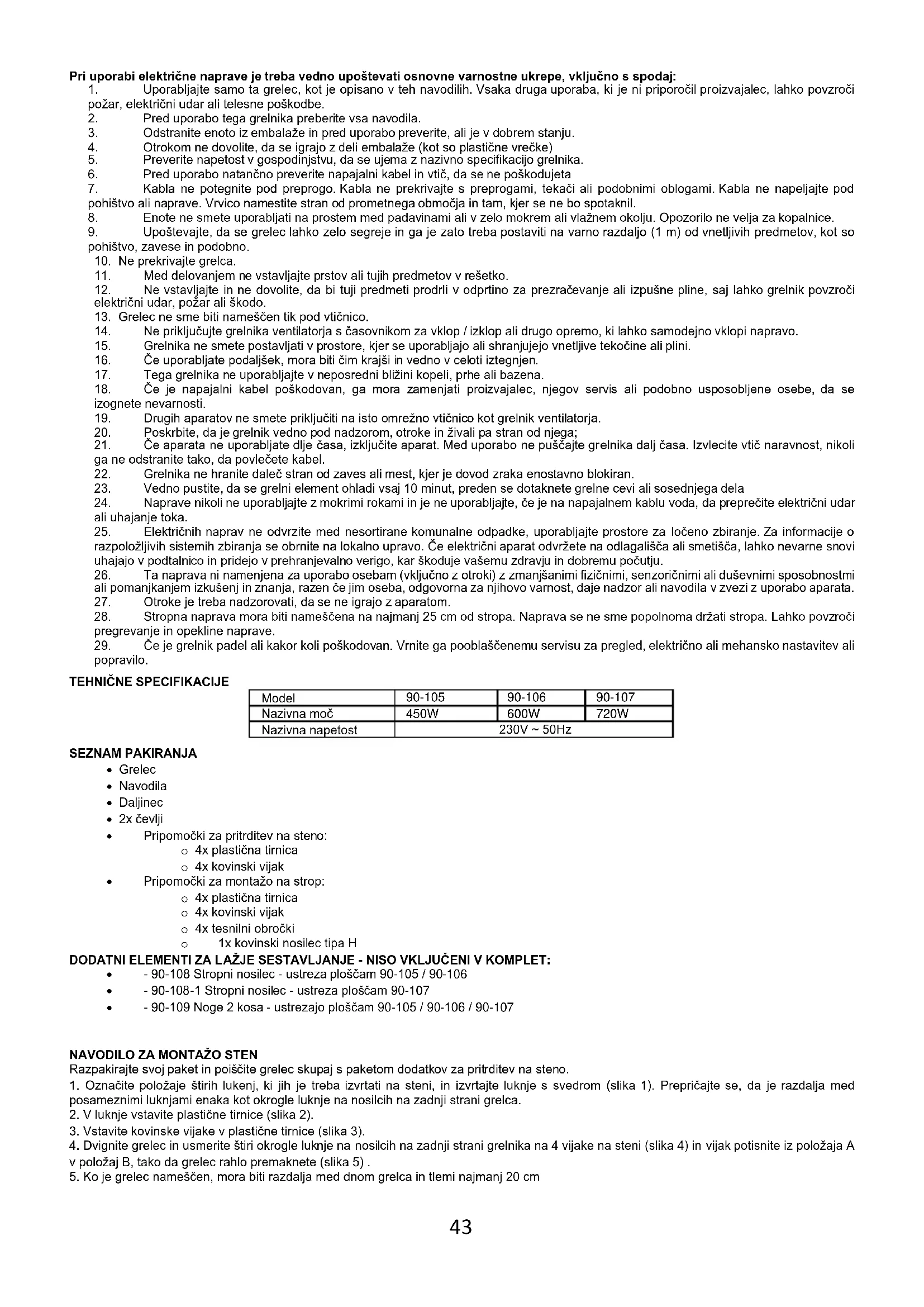 3. Otroci, stari od 3 let in manj kot 8 let, smejo aparat vklapljati / izklapljati le pod pogojem, da je bil postavljen ali nameščen v predvidenem običajnem delovnem položaju in je bil pod nadzorom ali navodili glede varne uporabe naprave in razumeti nevarnosti. Otroci, stari od 3 let in manj kot 8 let, ne smejo priključevati, regulirati in čistiti naprave ali izvajati vzdrževanja uporabnika. 4. Pozor - nekateri deli tega izdelka se lahko zelo segrejejo in povzročijo opekline. Posebno pozornost je treba nameniti tam, kjer so prisotni otroci in ranljivi ljudje.43 Pri uporabi električne naprave je treba vedno upoštevati osnovne varnostne ukrepe, vključno s spodaj: 1. Uporabljajte samo ta grelec, kot je opisano v teh navodilih. Vsaka druga uporaba, ki je ni priporočil proizvajalec, lahko povzroči požar, električni udar ali telesne poškodbe.