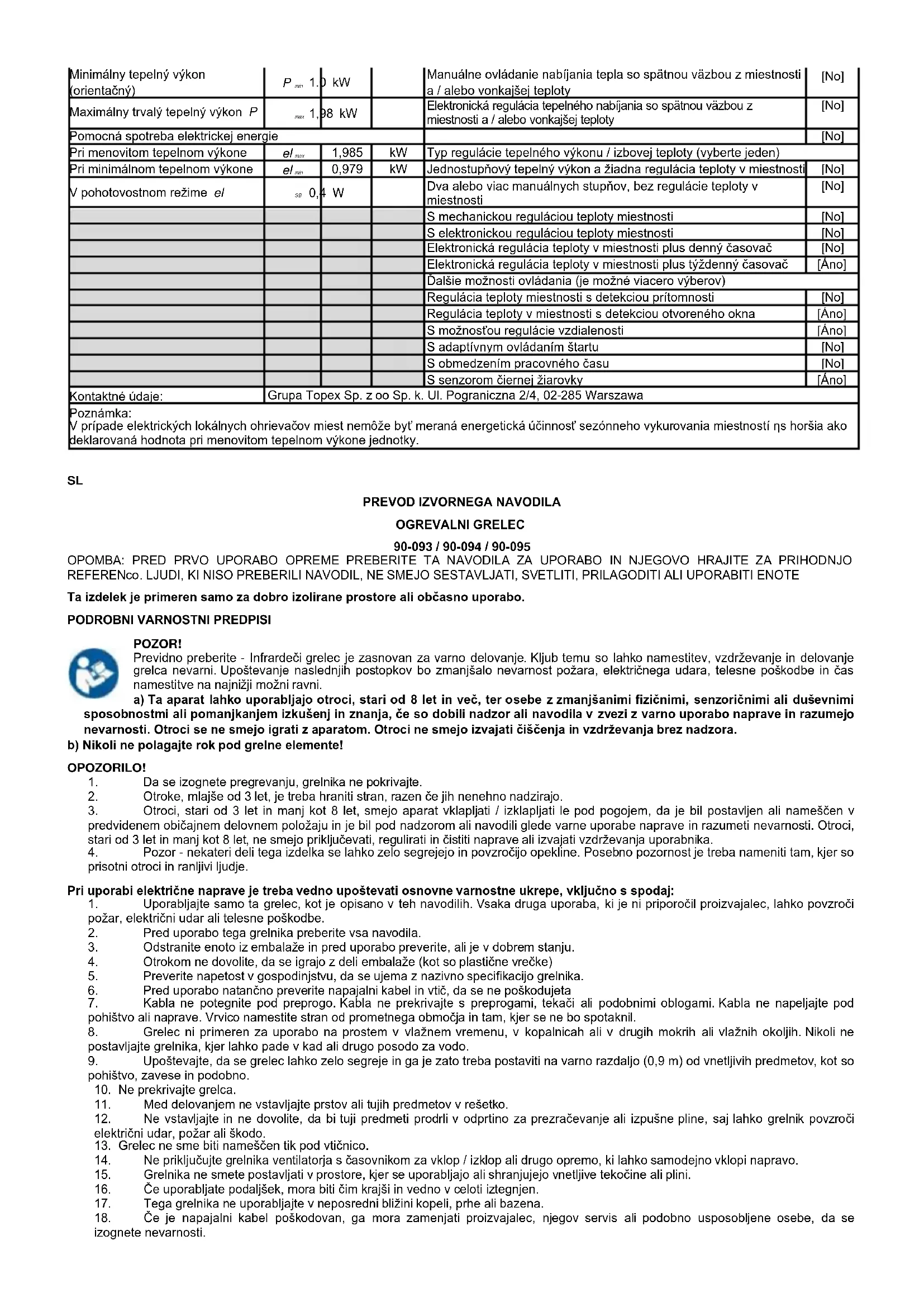 S senzorjem črne žarnice [ da ] Kontaktni podatki : Skupina Topex Sp. z oo Sp. k. Ul. Pograniczna 2/4, 02-285 Warszawa Opomba: Pri električnih lokalnih grelnikih prostorov izmerjena sezonska energetska učinkovitost ogrevanja prostorov ηs ne more biti slabša od deklarirane vrednosti pri nazivni toplotni moči enote.