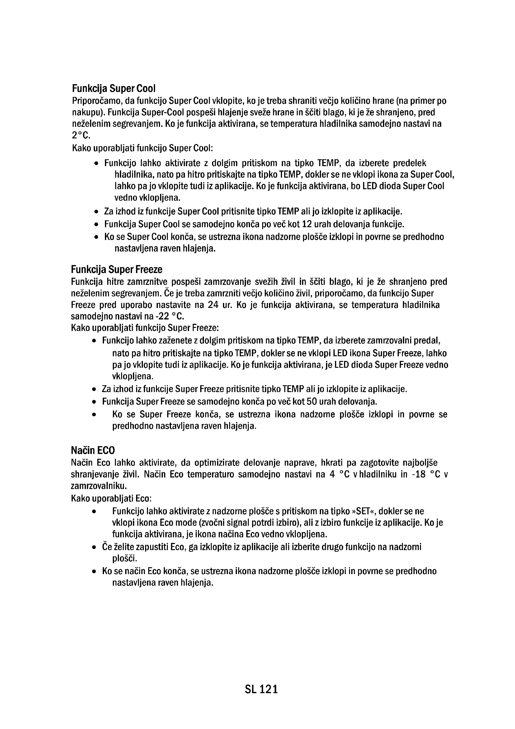 4SL 120 UPORABA A. Tipka za VKLOP/IZKLOP za vklop/izklop aparata B. Tipka SET, ki se uporablja za izbiro posebnih funkcij (Eco in Holiday) C. Tipka TEMP, ki se uporablja za izbiro temperature hladilnika in zamrzovalnika a. Ikona območja hladilnika/zamrzovalnika, prikazuje kateri predelek naprave je izbran b. Ravni temperature kažejo, katera temperatura je izbrana c. Ikona Super Cool, prikazuje, ali je funkcija Super Cool aktivirana d. Ravni temperature kažejo, katera temperatura je izbrana za zamrzovalnik e. Ikona Super Freeze, prikazuje, ali je funkcija Super Freeze aktivirana f. Ikona ekološkega načina prikazuje, ali je ekološki način aktiviran g. Ikona funkcije Holiday prikazuje, ali je funkcija Holiday aktivirana Uporaba