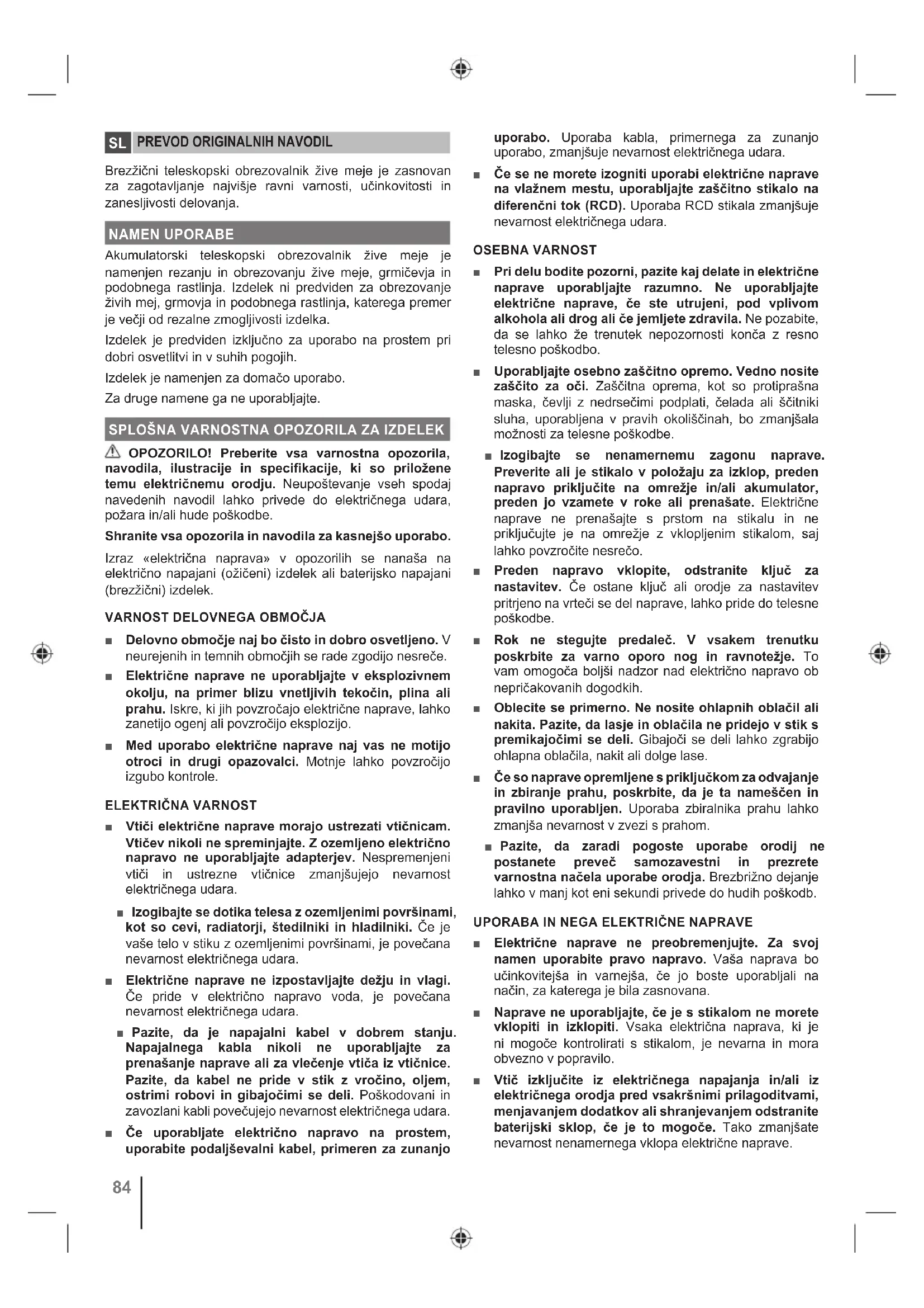 Električno napravo, ki je ne potrebujete, shranite izven dosega otrok in ne dovolite, da bi jo uporabljale osebe, ki električne naprave ne poznajo ali ne poznajo teh navodil. Električne naprave so v rokah neukih oseb nevarne. ■ Električna orodja in dodatke ustrezno vzdržujte. Preverite poravnavo ali zatikanje pomičnih delov. Preverite, da noben del ni poškodovan in vsa stanja, ki bi lahko vplivala na delovanje električne naprave. Če so sestavni deli poškodovani, jih pred uporabo naprave popravite. Veliko nesreč povzročijo prav slabo vzdrževane električne naprave. ■ Rezila naj bodo vedno ostra in čista. Pravilno vzdrževana rezila z ostrimi rezalnimi robovi se manj zatikajo in jih je lažje kontrolirati. ■ Električne naprave, dodatni pribor, orodne nastavke ipd. uporabljajte v skladu s temi navodili, pri čemer upoštevajte delovne pogoje in delo, ki ga je treba opraviti. Uporaba električne naprave za opravila, za katera ni namenjena, je lahko nevarna. ■ Ročice in prijemalne površine naj bodo suhe in čiste, na njih pa naj ne bo olja ter maziva. Če ročice in prijemalne površine drsijo, ne omogočajo varnega ravnanja in krmiljenja orodja v nepredvidenih okoliščinah.