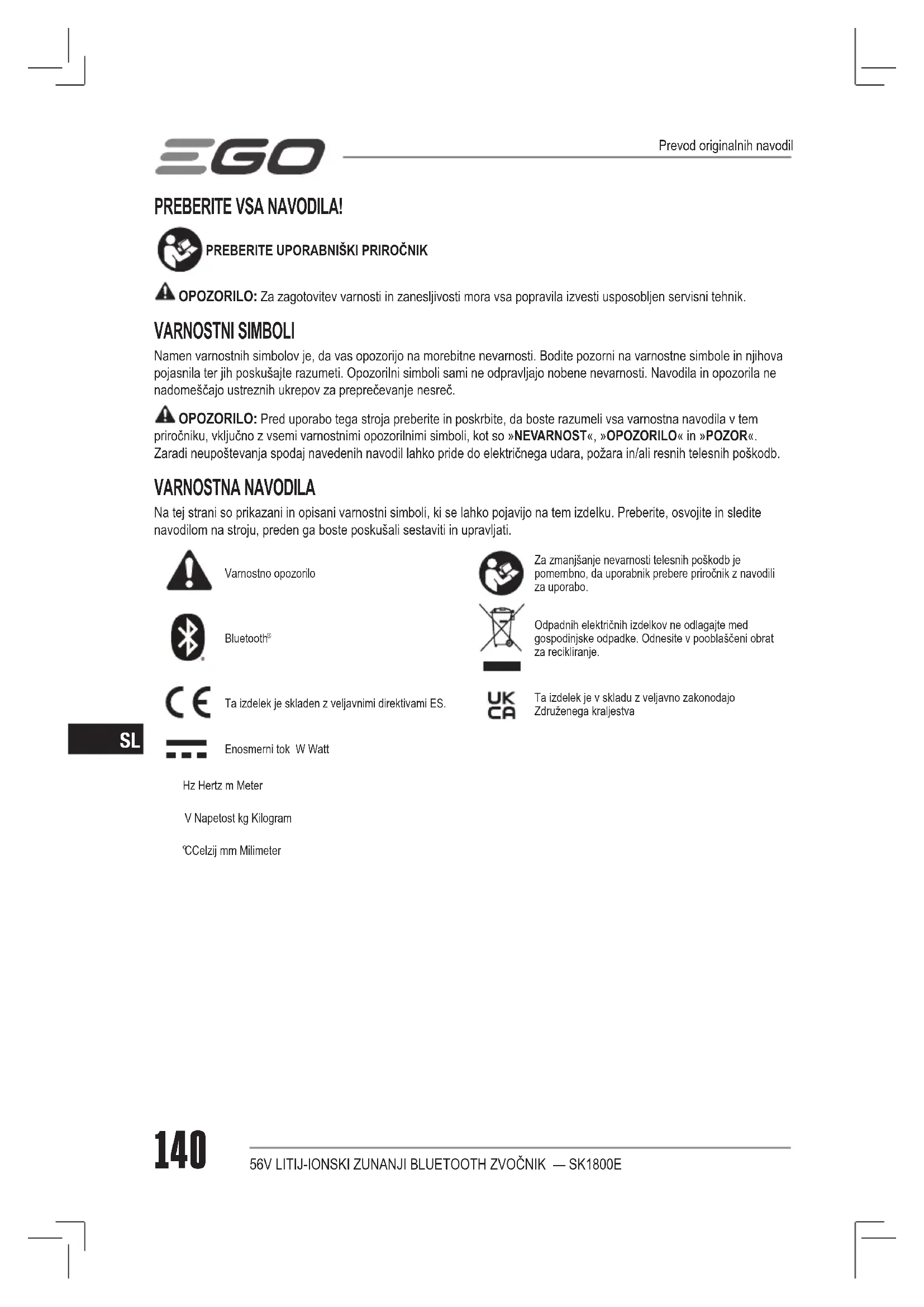 OPOZORILO: Za zagotovitev varnosti in zanesljivosti mora vsa popravila izvesti usposobljen servisni tehnik. VARNOSTNI SIMBOLI Namen varnostnih simbolov je, da vas opozorijo na morebitne nevarnosti. Bodite pozorni na varnostne simbole in njihova pojasnila ter jih poskušajte razumeti. Opozorilni simboli sami ne odpravljajo nobene nevarnosti. Navodila in opozorila ne nadomeščajo ustreznih ukrepov za preprečevanje nesreč. OPOZORILO: Pred uporabo tega stroja preberite in poskrbite, da boste razumeli vsa varnostna navodila v tem priročniku, vključno z vsemi varnostnimi opozorilnimi simboli, kot so »NEVARNOST«, »OPOZORILO« in »POZOR«. Zaradi neupoštevanja spodaj navedenih navodil lahko pride do električnega udara, požara in/ali resnih telesnih poškodb. VARNOSTNA NAVODILA Na tej strani so prikazani in opisani varnostni simboli, ki se lahko pojavijo na tem izdelku. Preberite, osvojite in sledite navodilom na stroju, preden ga boste poskušali sestaviti in upravljati. Varnostno opozoriloZa zmanjšanje nevarnosti telesnih poškodb je pomembno, da uporabnik prebere priročnik z navodili za uporabo.Bluetooth Odpadnih električnih izdelkov ne odlagajte med gospodinjske odpadke. Odnesite v pooblaščeni obrat za recikliranje.Ta izdelek je skladen z veljavnimi direktivami ES.Ta izdelek je v skladu z veljavno zakonodajo Združenega kraljestvaEnosmerni tok W Watt Hz Hertz m MeterV Napetost kg Kilogram C Celzij mm Milimeter Prevod originalnih navodil141