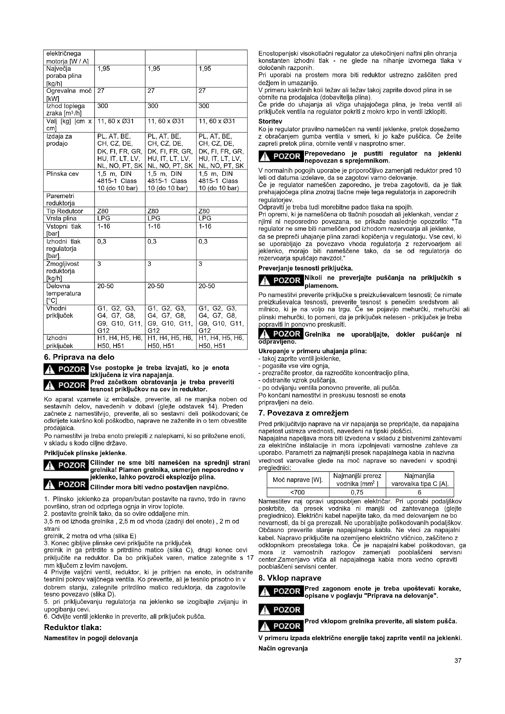 Moč 42 / 0,25 42 / 0,25 42 / 0,2537 električnega motorja [W / A] Največja poraba plina [kg/h] 1,95 1,95 1,95 Ogrevalna moč [kW]