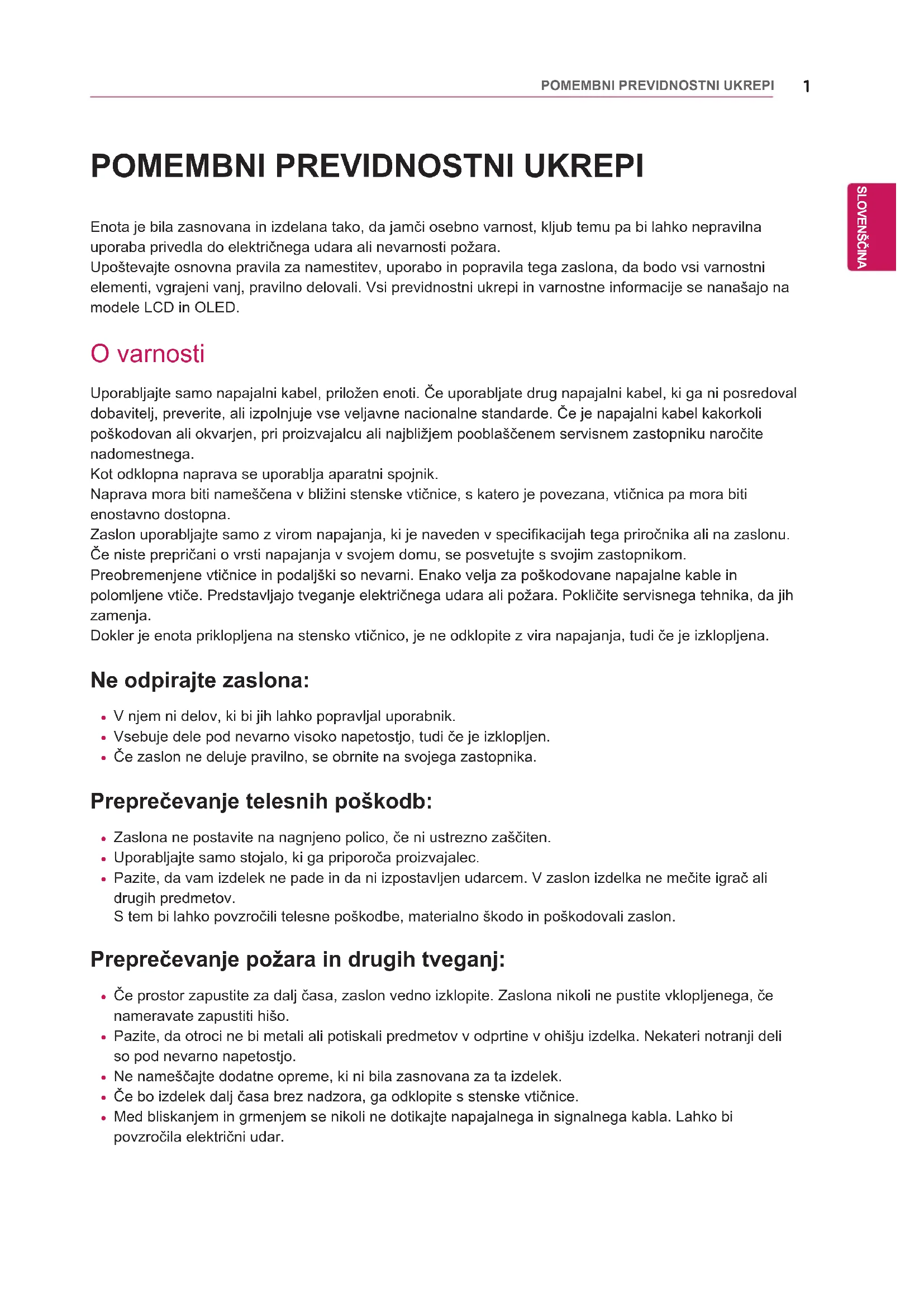 Enota je bila zasnovana in izdelana tako, da jamči osebno varnost, kljub temu pa bi lahko nepravilna uporaba privedla do električnega udara ali nevarnosti požara.Upoštevajte osnovna pravila za namestitev, uporabo in popravila tega zaslona, da bodo vsi varnostni elementi, vgrajeni vanj, pravilno delovali. Vsi previdnostni ukrepi in varnostne informacije se nanašajo na modele LCD in OLED. O varnosti Uporabljajte samo napajalni kabel, priložen enoti. Če uporabljate drug napajalni kabel, ki ga ni posredoval dobavitelj, preverite, ali izpolnjuje vse veljavne nacionalne standarde. Če je napajalni kabel kakorkoli poškodovan ali okvarjen, pri proizvajalcu ali najbližjem pooblaščenem servisnem zastopniku naročite nadomestnega.Kot odklopna naprava se uporablja aparatni spojnik. Naprava mora biti nameščena v bližini stenske vtičnice, s katero je povezana, vtičnica pa mora biti enostavno dostopna.Zaslon uporabljajte samo z virom napajanja, ki je naveden v specifikacijah tega priročnika ali na zaslonu.Če niste prepričani o vrsti napajanja v svojem domu, se posvetujte s svojim zastopnikom.Preobremenjene vtičnice in podaljški so nevarni. Enako velja za poškodovane napajalne kable in polomljene vtiče. Predstavljajo tveganje električnega udara ali požara. Pokličite servisnega tehnika, da jih zamenja.Dokler je enota priklopljena na stensko vtičnico, je ne odklopite z vira napajanja, tudi če je izklopljena. Ne odpirajte zaslona: