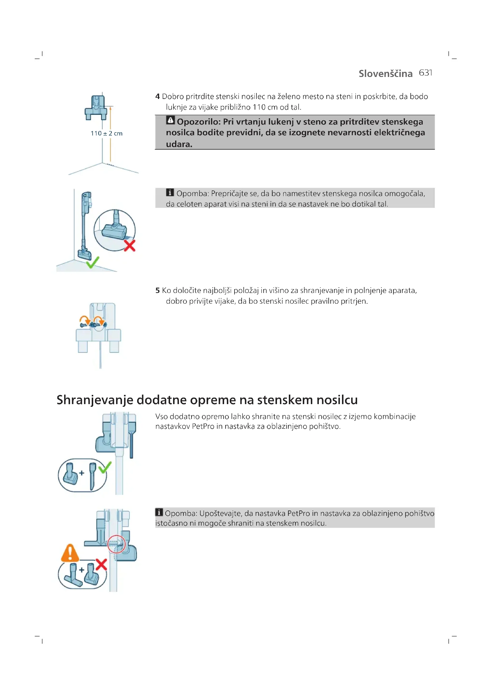2 Aparat polnite tako, da ga postavite v sestavljeni stenski nosilec. Opozorilo: Aparat shranjujte in polnite pri temperaturi nad 5 °C in pod 40 °C. Opomba: Ročno enoto lahko tudi postavite na vodoravno in trdno površino ter neposredno priključite kabel za polnjenje na aparat.