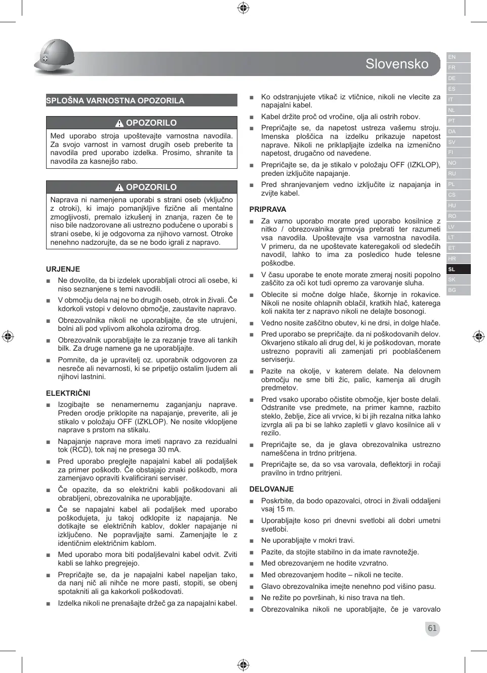 Napetost Prosimo, da si pred zagonom naprave pozorno preberete navodila. Nosite zaščito za oči in ušesa. Ko uporabljate to opremo, nosite zaščitno obutev, ki ne drsi. Nosite si nedrseče, močne delovne zaščitne rokavice. Izogibajte se uporabi v vlažnih razmerah. Ta naprava ni predvidena za uporabo ozobljenih rezil, kot jih uporablja krožna žaga. Slovensko