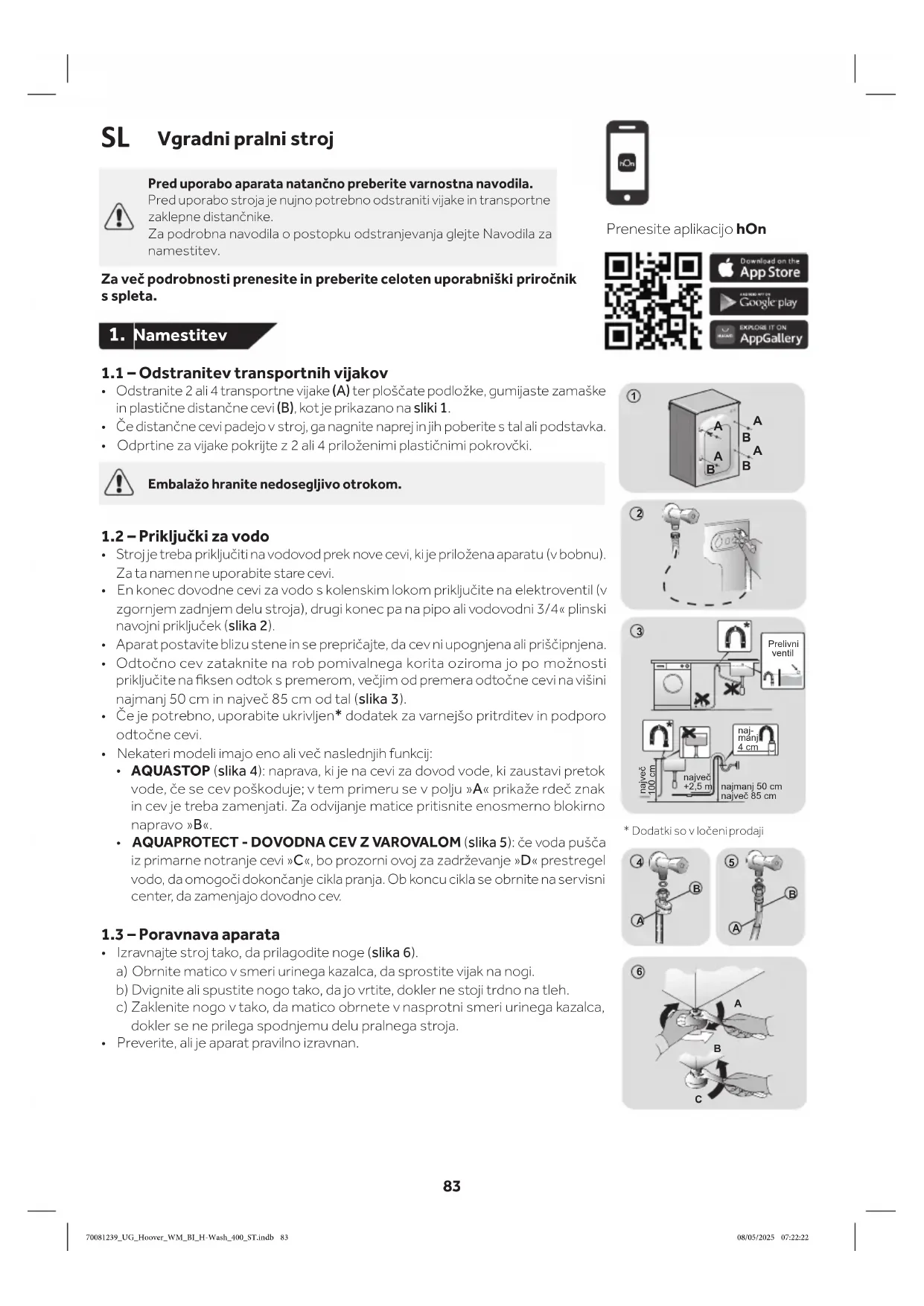Pred uporabo aparata natančno preberite varnostna navodila. Pred uporabo stroja je nujno potrebno odstraniti vijake in transportne zaklepne distančnike. Za podrobna navodila o postopku odstranjevanja glejte Navodila za namestitev. Za več podrobnosti prenesite in preberite celoten uporabniški priročnik s spleta. Prenesite aplikacijo hOn