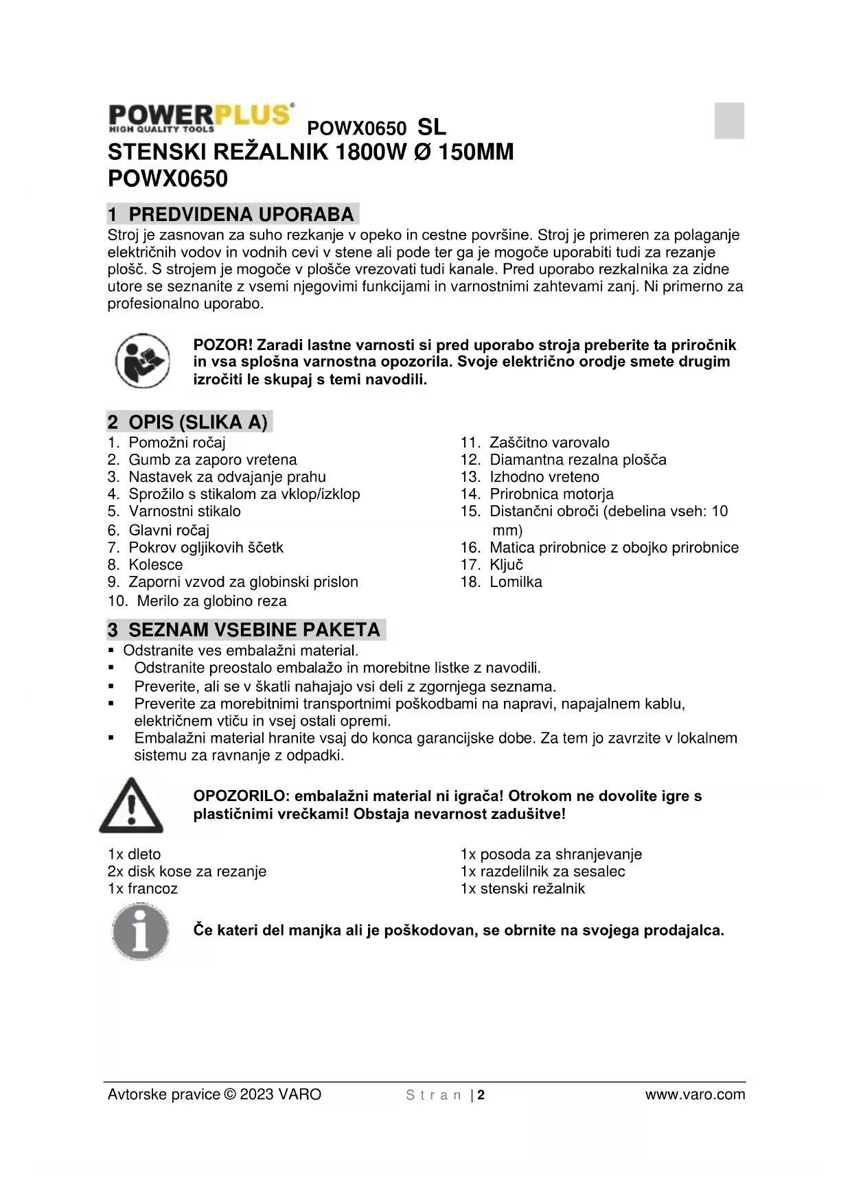 - Mehak zagon: Stroj je opremljen z mehanizmom za mehak zagon.POWX0650 SL Avtorske pravice © 2023 VARO S t r a n | 7 www.varo.com