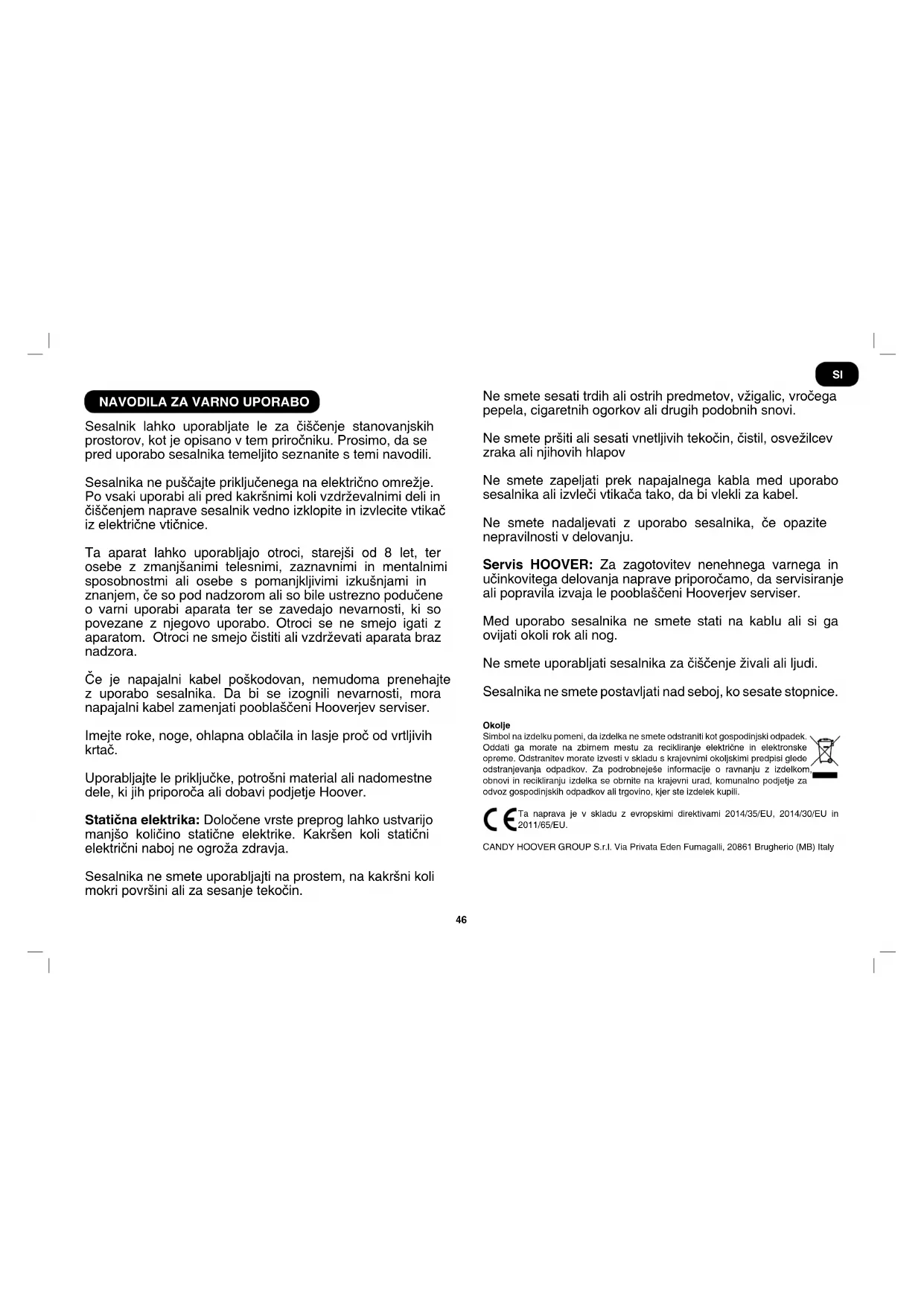 POMEMBNE INFORMACIJE Nadomestni deli in potrošni material Hoover Vedno uporabljajte originalne nadomestne dele Hoover. Dobite jih pri krajevnem prodajalcu Hooverjevih izdelkov. Pri naročanju delov vedno navedite številko modela. Hooverjev servis Če boste potrebovali servisno storitev, vas prosimo, da se obrnete na pooblaščeni krajevni Hooverjev servis. Kakovost BSI ISO 9001 Hooverjeve tovarne so bile predmet neodvisnega ocenjevanja kakovosti. Naši izdelki so izdelani na osnovi sistema kakovosti, ki izpolnjuje zahteve standarda ISO 9001. Vaša garancija Garancijski pogoji za to napravo so taki, kot jih določi zastopnik v državi, kjer je naprava prodana. Podrobnosti glede garancijskih pogojev lahko dobite od prodajalca, pri katerem ste napravo kupili. Če želite uveljavljati kakršno koli garancijo, potrebujete potrdilo o nakupu ali račun. Garancija se lahko spreminja brez predhodnega obvestila.49