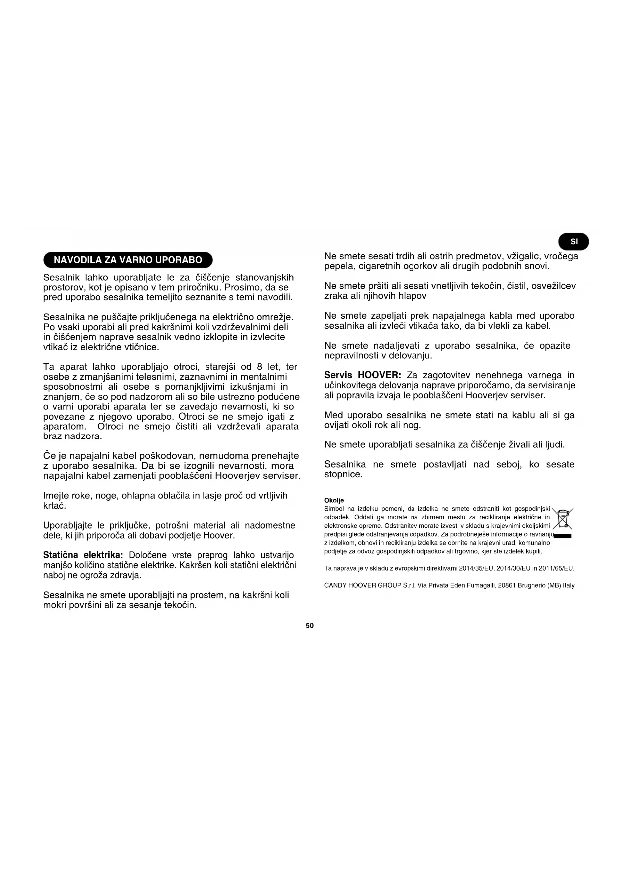 Sesalnik lahko uporabljate le za čiščenje stanovanjskih prostorov, kot je opisano v tem priročniku. Prosimo, da se pred uporabo sesalnika temeljito seznanite s temi navodili. Sesalnika ne puščajte priključenega na električno omrežje. Po vsaki uporabi ali pred kakršnimi koli vzdrževalnimi deli in čiščenjem naprave sesalnik vedno izklopite in izvlecite vtikač iz električne vtičnice. Ta aparat lahko uporabljajo otroci, starejši od 8 let, ter osebe z zmanjšanimi telesnimi, zaznavnimi in mentalnimi sposobnostmi ali osebe s pomanjkljivimi izkušnjami in znanjem, če so pod nadzorom ali so bile ustrezno podučene o varni uporabi aparata ter se zavedajo nevarnosti, ki so povezane z njegovo uporabo. Otroci se ne smejo igati z aparatom. Otroci ne smejo čistiti ali vzdrževati aparata braz nadzora. Če je napajalni kabel poškodovan, nemudoma prenehajte z uporabo sesalnika. Da bi se izognili nevarnosti, mora napajalni kabel zamenjati pooblaščeni Hooverjev serviser. Imejte roke, noge, ohlapna oblačila in lasje proč od vrtljivih krtač. Uporabljajte le priključke, potrošni material ali nadomestne dele, ki jih priporoča ali dobavi podjetje Hoover. Statična elektrika: Določene vrste preprog lahko ustvarijo manjšo količino statične elektrike. Kakršen koli statični električni naboj ne ogroža zdravja. Sesalnika ne smete uporabljajti na prostem, na kakršni koli mokri površini ali za sesanje tekočin. Ne smete sesati trdih ali ostrih predmetov, vžigalic, vročega pepela, cigaretnih ogorkov ali drugih podobnih snovi. Ne smete pršiti ali sesati vnetljivih tekočin, čistil, osvežilcev zraka ali njihovih hlapov Ne smete zapeljati prek napajalnega kabla med uporabo sesalnika ali izvleči vtikača tako, da bi vlekli za kabel. Ne smete nadaljevati z uporabo sesalnika, če opazite nepravilnosti v delovanju. Servis HOOVER: Za zagotovitev nenehnega varnega in učinkovitega delovanja naprave priporočamo, da servisiranje ali popravila izvaja le pooblaščeni Hooverjev serviser. Med uporabo sesalnika ne smete stati na kablu ali si ga ovijati okoli rok ali nog. Ne smete uporabljati sesalnika za čiščenje živali ali ljudi. Sesalnika ne smete postavljati nad seboj, ko sesate stopnice. Okolje Simbol na izdelku pomeni, da izdelka ne smete odstraniti kot gospodinjski odpadek. Oddati ga morate na zbirnem mestu za recikliranje električne in elektronske opreme. Odstranitev morate izvesti v skladu s krajevnimi okoljskimi predpisi glede odstranjevanja odpadkov. Za podrobneješe informacije o ravnanju z izdelkom, obnovi in recikliranju izdelka se obrnite na krajevni urad, komunalno podjetje za odvoz gospodinjskih odpadkov ali trgovino, kjer ste izdelek kupili. Ta naprava je v skladu z evropskimi direktivami 2014/35/EU, 2014/30/EU in 2011/65/EU. CANDY HOOVER GROUP S.r.l. Via Privata Eden Fumagalli, 20861 Brugherio (MB) Italy SI51 SESTAVLJANJE SESALNIKA Iz embalaže odstranite vse sestavne dele.