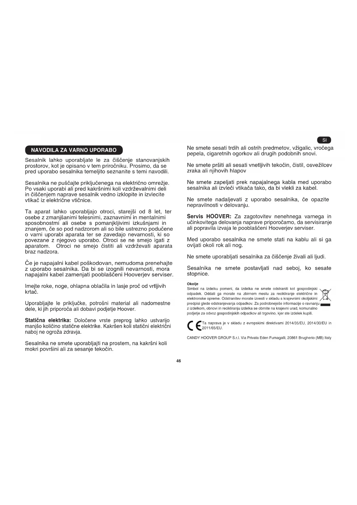 Sesalnik lahko uporabljate le za čiščenje stanovanjskih prostorov, kot je opisano v tem priročniku. Prosimo, da se pred uporabo sesalnika temeljito seznanite s temi navodili. Sesalnika ne puščajte priključenega na električno omrežje. Po vsaki uporabi ali pred kakršnimi koli vzdrževalnimi deli in čiščenjem naprave sesalnik vedno izklopite in izvlecite vtikač iz električne vtičnice. Ta aparat lahko uporabljajo otroci, starejši od 8 let, ter osebe z zmanjšanimi telesnimi, zaznavnimi in mentalnimi sposobnostmi ali osebe s pomanjkljivimi izkušnjami in znanjem, če so pod nadzorom ali so bile ustrezno podučene o varni uporabi aparata ter se zavedajo nevarnosti, ki so povezane z njegovo uporabo. Otroci se ne smejo igati z aparatom. Otroci ne smejo čistiti ali vzdrževati aparata braz nadzora. Če je napajalni kabel poškodovan, nemudoma prenehajte z uporabo sesalnika. Da bi se izognili nevarnosti, mora napajalni kabel zamenjati pooblaščeni Hooverjev serviser. Imejte roke, noge, ohlapna oblačila in lasje proč od vrtljivih krtač. Uporabljajte le priključke, potrošni material ali nadomestne dele, ki jih priporoča ali dobavi podjetje Hoover. Statična elektrika: Določene vrste preprog lahko ustvarijo manjšo količino statične elektrike. Kakršen koli statični električni naboj ne ogroža zdravja. Sesalnika ne smete uporabljajti na prostem, na kakršni koli mokri površini ali za sesanje tekočin. Ne smete sesati trdih ali ostrih predmetov, vžigalic, vročega pepela, cigaretnih ogorkov ali drugih podobnih snovi. Ne smete pršiti ali sesati vnetljivih tekočin, čistil, osvežilcev zraka ali njihovih hlapov Ne smete zapeljati prek napajalnega kabla med uporabo sesalnika ali izvleči vtikača tako, da bi vlekli za kabel. Ne smete nadaljevati z uporabo sesalnika, če opazite nepravilnosti v delovanju. Servis HOOVER: Za zagotovitev nenehnega varnega in učinkovitega delovanja naprave priporočamo, da servisiranje ali popravila izvaja le pooblaščeni Hooverjev serviser. Med uporabo sesalnika ne smete stati na kablu ali si ga ovijati okoli rok ali nog. Ne smete uporabljati sesalnika za čiščenje živali ali ljudi. Sesalnika ne smete postavljati nad seboj, ko sesate stopnice. Okolje Simbol na izdelku pomeni, da izdelka ne smete odstraniti kot gospodinjski odpadek. Oddati ga morate na zbirnem mestu za recikliranje električne in elektronske opreme. Odstranitev morate izvesti v skladu s krajevnimi okoljskimi predpisi glede odstranjevanja odpadkov. Za podrobneješe informacije o ravnanju z izdelkom, obnovi in recikliranju izdelka se obrnite na krajevni urad, komunalno podjetje za odvoz gospodinjskih odpadkov ali trgovino, kjer ste izdelek kupili. Ta naprava je v skladu z evropskimi direktivami 2014/35/EU, 2014/30/EU in 2011/65/EU. CANDY HOOVER GROUP S.r.l. Via Privata Eden Fumagalli, 20861 Brugherio (MB) Italy SI*Le pri določenih modelih ** Samo določeni modeli, nastavki se lahko spreminjajo glede na model.