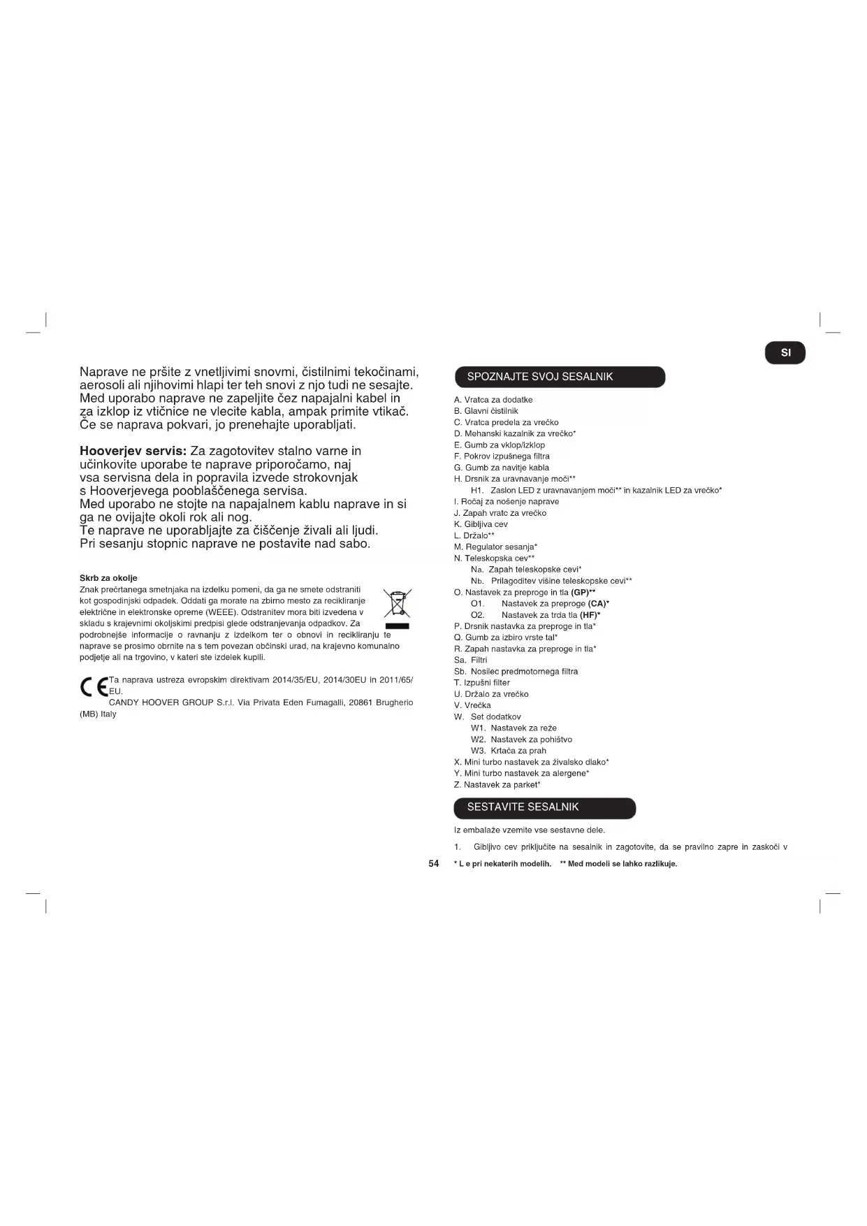 Ta naprava je namenjena le za čiščenje v gospodinjstvih, in sicer skladno s temi navodili za uporabo. Prosimo, zagotovite, da pred uporabo sesalnika popolnoma razumete napotke in opozorila v njih. Naprave ne puščajte vključene v omrežje. Po uporabi in preden jo začnete čistiti ali na njej izvajati vzdrževalna dela, j o ugasnite in napajalni kabel izključite iz omrežne vtičnice. To napravo lahko otroci, starejši od 8 let, ter ljudje z zmanjšanimi telesnimi, zaznavnimi ali miselnimi sposobnostmi ali s pomanjkanjem izkušenj uporabljajo le, če so pri tem nadzorovani ali če so prej dobili napotke za pravilno uporabo in tudi razumejo z njo povezana tveganja. Otroci se z napravo ne smejo igrati, brez nadzora odraslih naprave ne smejo niti čistiti ali na njej opravljati vzdrževalna dela. Če se napajalni kabel poškoduje, napravo takoj prenehajte uporabljati. Da se izognete nevarnosti električnega udara, naj kabel zamenja strokovnjak s Hooverjevega pooblaščenega servisa. Roke, stopala, oblačila in lase držite stran od vrtljivih krtač na nastavku. Uporabljajte samo dodatke, potrošni material ali n adomestne dele, ki jih priporoča ali izdeluje Hoover. Statična elektrika: Nekatere talne obloge lahko povzročajo manjše nastajanje statične elektrike. Njeno sproščanje ni zdravju škodljivo. Tega sesalnika ne uporabljajte zunaj, na mokrih površinah ali za sesanje mokrih reči. Ne sesajte ostrih ali koničastih predmetov, vžigalic, žerjavice, vročega pepela, cigaretnih ogorkov in podobnega.izmaritleri veya diğer benzeri öğeleri toplamayın. Yanıcı sıvıları, temizleme sıvılarını, aerosolleri veya spreyleri püskürtmeyin ya da toplamayın. SI54 Naprave ne pršite z vnetljivimi snovmi, čistilnimi tekočinami, aerosoli ali njihovimi hlapi ter teh snovi z njo tudi ne sesajte. Med uporabo naprave ne zapeljite čez napajalni kabel in za izklop iz vtičnice ne vlecite kabla, ampak primite vtikač. Če se naprava pokvari, jo prenehajte uporabljati. Hooverjev servis: Za zagotovitev stalno varne in učinkovite uporabe te naprave priporočamo, naj vsa servisna dela in popravila izvede strokovnjak s Hooverjevega pooblaščenega servisa. Med uporabo ne stojte na napajalnem kablu naprave in si ga ne ovijajte okoli rok ali nog. Te naprave ne uporabljajte za čiščenje živali ali ljudi. Pri sesanju stopnic naprave ne postavite nad sabo. Skrbzaokolje Znak prečrtanega smetnjaka na izdelku pomeni, da ga ne smete odstraniti kot gospodinjski odpadek. Oddati ga morate na zbirno mesto za recikliranje električne in elektronske opreme (WEEE). Odstranitev mora biti izvedena v skladu s krajevnimi okoljskimi predpisi glede odstranjevanja odpadkov. Za podrobnejše informacije o ravnanju z izdelkom ter o obnovi in recikliranju te naprave se prosimo obrnite na s tem povezan občinski urad, na krajevno komunalno podjetje ali na trgovino, v kateri ste izdelek kupili. Ta naprava ustreza evropskim direktivam 2014/35/EU, 2014/30EU in 2011/65/ EU. CANDY HOOVER GROUP S.r.l. Via Privata Eden Fumagalli, 20861 Brugherio (MB) Italy