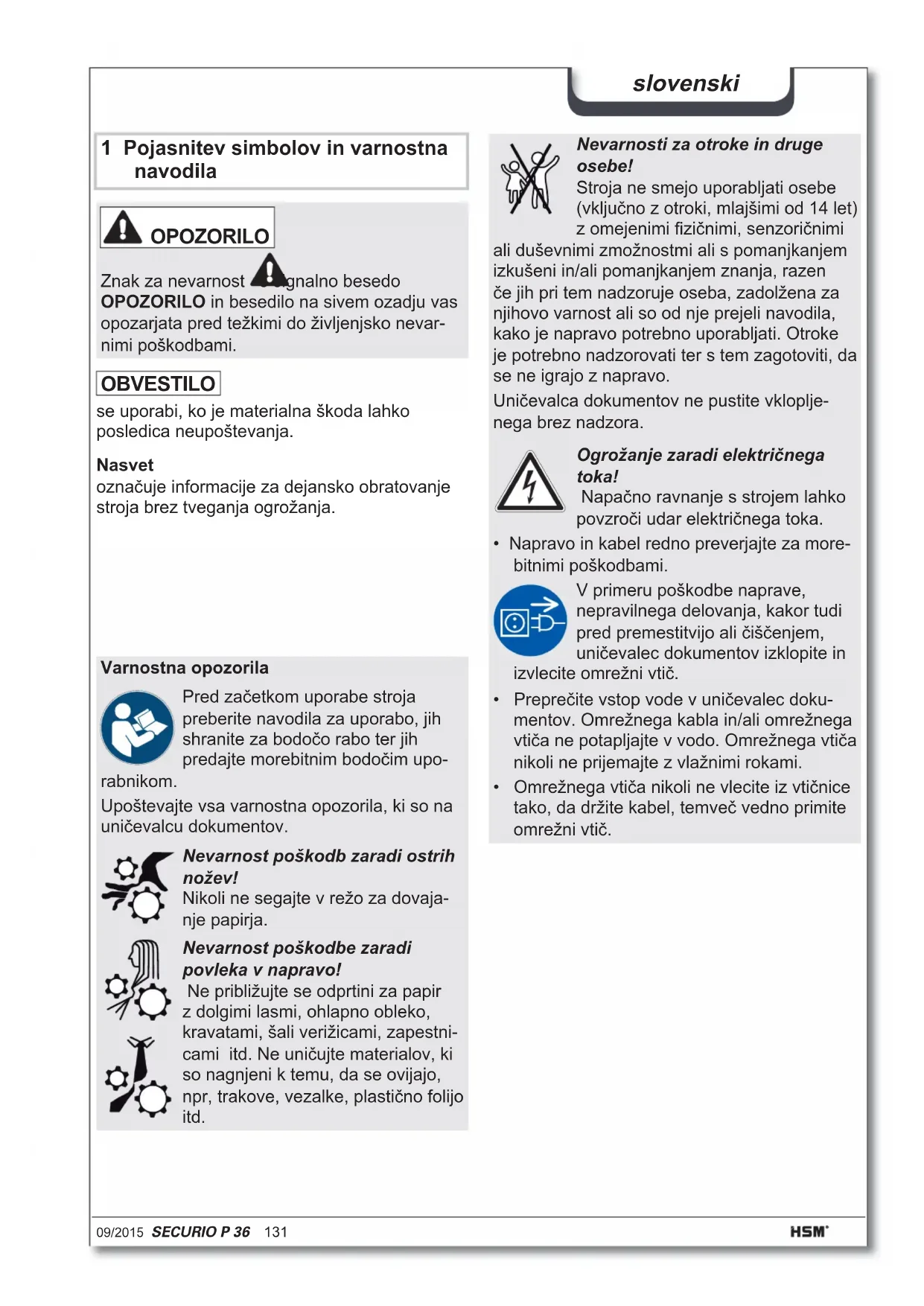 - Rezalni mehanizem naj brez dovajanja papirja teče pribl. 10 sekund v stalnem načinu. Papirni prah in delci se sprostijo. OPOZORILO Nevarna omrežna napetost! Napačno ravnanje s strojem lahko povzroči udar električnega toka. Pred menjavo mesta postavitve ali čiščenjem izklopite uničevalec listin in izvlecite omrežni vtič. Servisna dela, ki so povezana z odstranitvijo pokrova ohišja, sme opraviti le HSM servisna služba in servisni tehniki naših pogodbenih partnerjev. Za naslove servisnih služb glejte stran 180.138 SECURIO P 36 09/2015 slovenski Uničevalec listin izpolnjuje zadevne harmonizirane predpise Evropske unije: