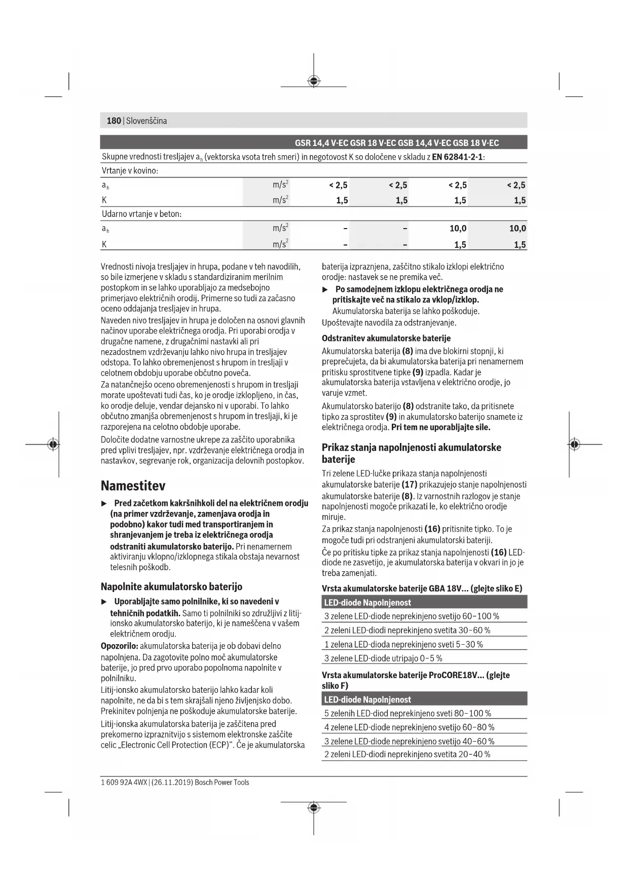 A-vrednotena raven hrupa za električno orodje običajno znaša: raven zvočnega tlaka87dB(A); raven zvočne moči98dB(A). Negotovost K=5dB. Uporabljajte zaščito za sluh! Bosch Power Tools 1 609 92A 4WX | (26.11.2019)180 | Slovenščina GSR 14,4 V-EC GSR 18 V-EC GSB 14,4 V-EC GSB 18 V-EC Skupne vrednosti tresljajev a