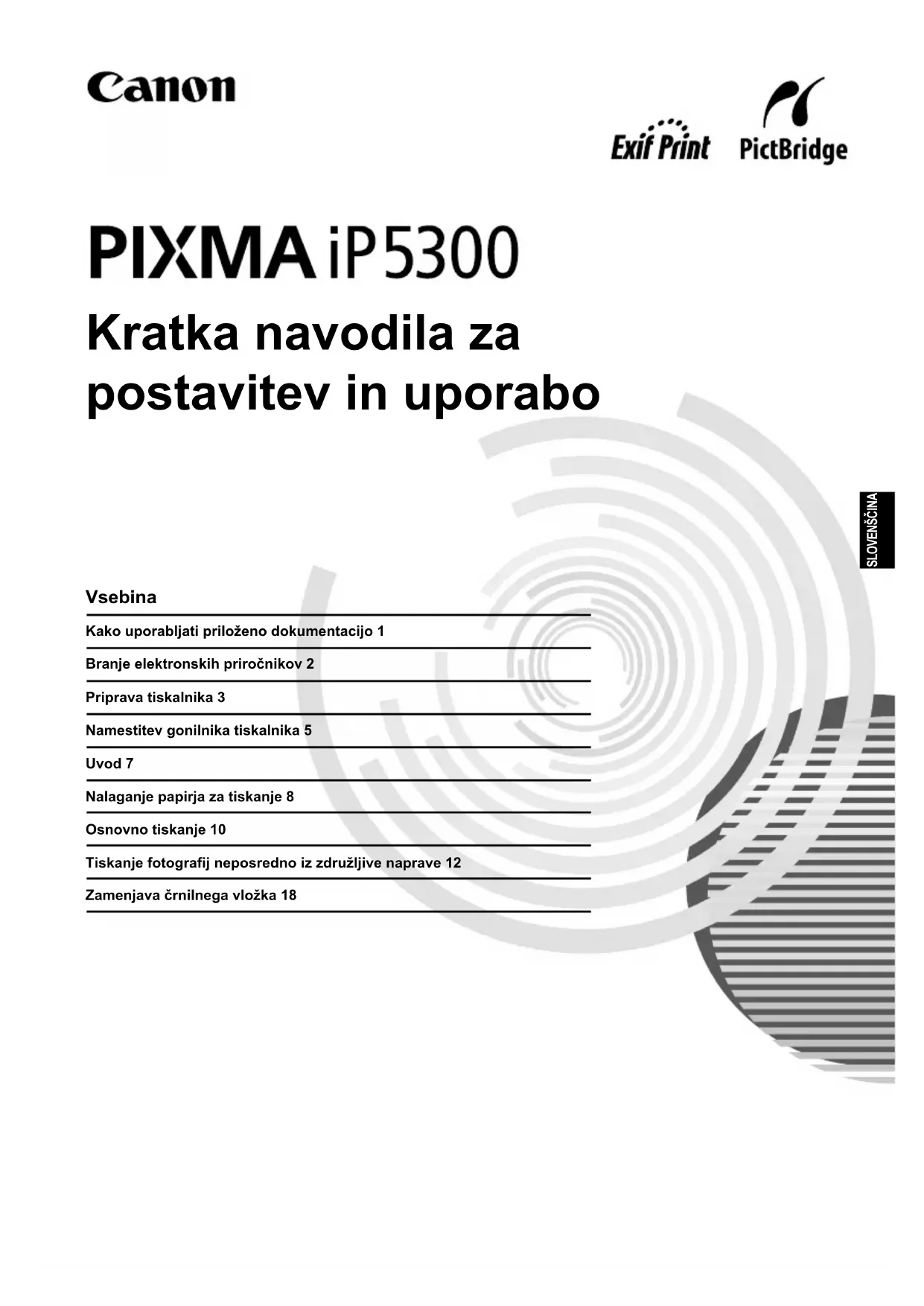 ýrnilnih vložkov ne stresajte in pazite, da ne padejo na tla, ker lahko þrnilo izteþe ter si umažete oblaþila in roke. Preberite tudi Varnostne ukrepe v elektronskem priroþniku [User’s Guide / Navodila za uporabo]. Upoštevajte opozorila, da bi se izognili telesnim poškodbam ali poškodovanju tiskalnika.1Kako uporabljati priloženo dokumentacijo SLOVENŠýINA Kako uporabljati priloženo dokumentacijo Napotki za enostavno postavitev (Namestitveni list) Najprej preberite ta list. List vsebuje navodila za namestitev tiskalnika in njegovo pripravo za uporabo. Kratka navodila za postavitev in uporabo (ta navodila) Ta navodila preberite pred uporabo tiskalnika. Priporoþamo vam, da potem ko preberete navodila v Napotkih za enostavno postavitev (Namestitveni list), preberete ta navodila, da spoznate osnovne postopke, na primer tiskanje iz raþunalnika in naprave, ki podpira PictBridge. Elektronski priroþniki [User’s Guide / Navodila za uporabo] Ta navodila preberite pred uporabo tiskalnika. ýe vam Kratka navodila za postavitev in uporabo ne nudijo dovolj informacij, si oglejte [User’s Guide / Navodila za uporabo], ki jih lahko namestite s [Setup CD-ROM / Namestitveni CD-ROM]. Ta priroþnik nudi podrobnejša navodila za: z tiskanje iz raþunalnika z združljive vrste medijev z redno vzdrževanje z odpravljanje težav Na voljo so tudi dodatni priroþniki za napredne funkcije. [Printer Driver Guide / Navodila za gonilnik tiskalnika] Ta priroþnik vsebuje celotna navodila za postavitev gonilnika za tiskalnik. [Photo Application Guide / Navodila za fotografsko aplikacijo] Ta priroþnik vsebuje celotna navodila za uporabo programske aplikacije na [Setup CD-ROM / Namestitveni CD-ROM].2 Branje elektronskih priroþnikov SLOVENŠýINA Branje elektronskih priroþnikov Poleg teh Kratkih navodilih za postavitev in uporabo so tiskalniku priloženi še elektronski priroþniki. Za podrobna navodila o namestitvi elektronskih priroþnikov si oglejte Napotke za enostavno postavitev (Namestitveni list). Elektronske priroþnike si lahko ogledate na naslednji naþin: Za ogled elektronskega priroþnika dvokliknite ikono bližnjice [iP5300 On-screen Manual / Elektronski priroþnik iP5300] na namizju ali kliknite [Start] > [All Programs / Vsi programi] (ali [Programs / Programi]) > [Canon iP5300 Manual / Priroþnik za Canon] > [iP5300 On-screen Manual / Elektronski priroþnik iP5300]. Sistemske zahteve Brskalnik: Pregledovalnik pomoþi v formatu HTML Windows Za ogled elektronskega priroþnika dvokliknite ikono [iP5300 On-screen Manual / Elektronski priroþnik iP5300] na zaslonu. Sistemske zahteve Brskalnik: Pregledovalnik pomoþi Opomba z Namešþen mora biti Microsoft Internet Explorer