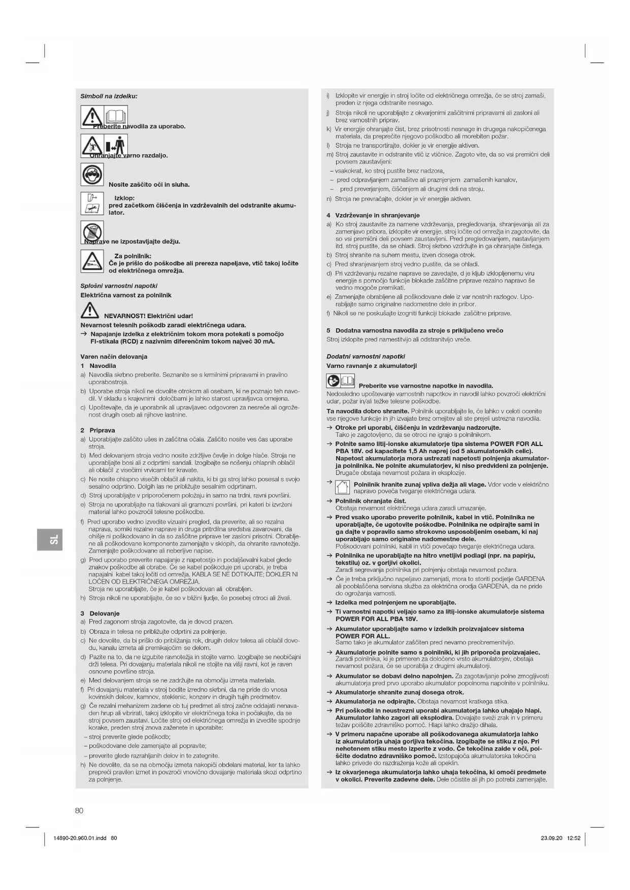 Polnilnik hranite zunaj vpliva dežja ali vlage. Vdor vode v električno napravo poveča tveganje električnega udara. v Polnilnik ohranjate čist. Obstaja nevarnost električnega udara zaradi umazanije. v Pred vsako uporabo preverite polnilnik, kabel in vtič. Polnilnika ne uporabljajte, če ugotovite poškodbe. Polnilnika ne odpirajte sami in ga dajte v popravilo samo strokovno usposobljenim osebam, ki naj uporabljajo samo originalne nadomestne dele. Poškodovani polnilniki, kabli in vtiči povečajo tveganje električnega udara. v Polnilnika ne uporabljajte na hitro vnetljivi podlagi (npr. na papirju, tekstilu) oz. v gorljivi okolici. Zaradi segrevanja polnilnika pri polnjenju obstaja nevarnost požara. v Če je treba priključno napeljavo zamenjati, mora to storiti podjetje GARDENA ali pooblaščena servisna služba za električna orodja GARDENA, da ne pride do ogrožanja varnosti. v Izdelka med polnjenjem ne uporabljajte. v Ti varnostni napotki veljajo samo za litij-ionske akumulatorje sistema POWER FOR ALL PBA 18V. v Akumulator uporabljajte samo v izdelkih proizvajalcev sistema POWER FOR ALL. Samo tako je akumulator zaščiten pred nevarno preobremenitvijo. v Akumulatorje polnite samo s polnilniki, ki jih priporoča proizvajalec. Zaradi polnilnika, ki je primeren za določeno vrsto akumulatorjev, obstaja nevarnost požara, če se uporablja z drugimi akumulatorji. v Akumulator se dobavi delno napolnjen. Za zagotavljanje polne zmogljivosti akumulatorja pred prvo uporabo akumulator popolnoma napolnite v polnilniku. v Akumulatorje shranite zunaj dosega otrok. v Akumulatorja ne odpirajte. Obstaja nevarnost kratkega stika. v Pri poškodbi in neustrezni uporabi akumulatorja lahko uhajajo hlapi. Akumulator lahko zagori ali eksplodira. Dovajajte sveži zrak in v primeru težav poiščite zdravniško pomoč. Hlapi lahko dražijo dihala. v V primeru napačne uporabe ali poškodovanega akumulatorja lahko iz akumulatorja uhaja gorljiva tekočina. Izogibajte se stiku z njo. Pri nehotenem stiku mesto izperite z vodo. Če tekočina zaide v oči, poi- ščite dodatno zdravniško pomoč. Izstopajoča akumulatorska tekočina lahko privede do razdraženja kože ali opeklin. v Iz okvarjenega akumulatorja lahko uhaja tekočina, ki omoči predmete v okolici. Preverite zadevne dele. Dele očistite ali jih po potrebi zamenjajte. 14890-20.960.01.indd 80 23.09.20 12:52SL
