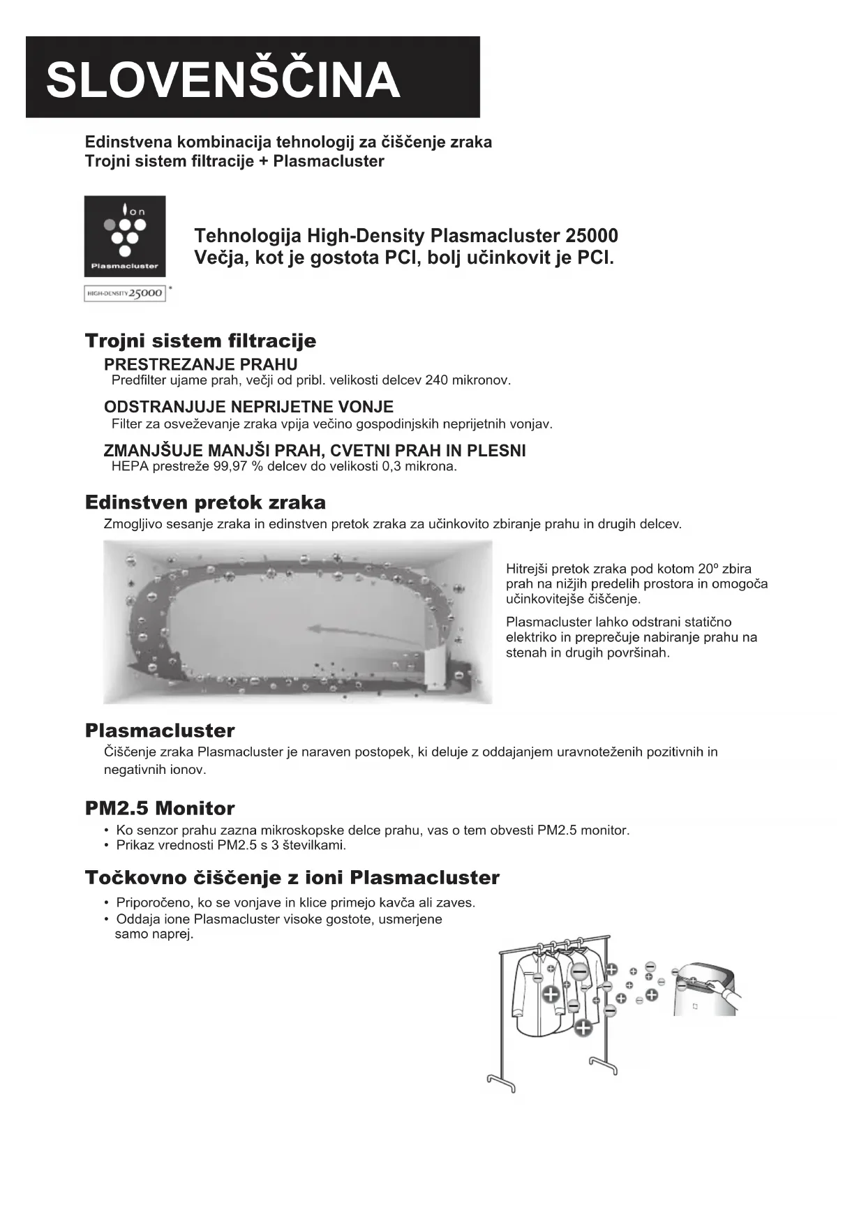 Hitrejši pretok zraka pod kotom 20º zbira prah na nižjih predelih prostora in omogoča učinkovitejše čiščenje. Plasmacluster lahko odstrani statično elektriko in preprečuje nabiranje prahu na stenah in drugih površinah.