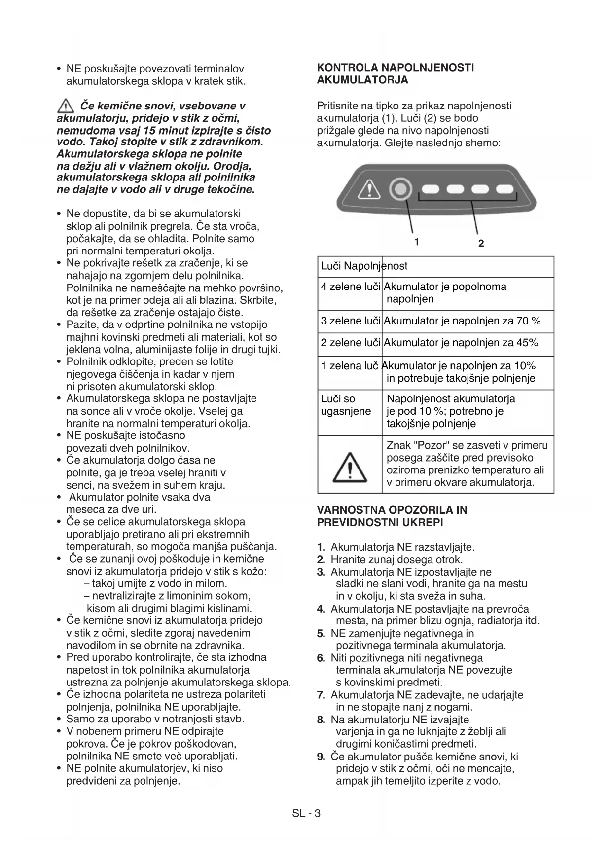 - Polnilnika NE uporabljajte za drugačne namene od tistih, ki so navedeni v tem priročniku.SL - 3