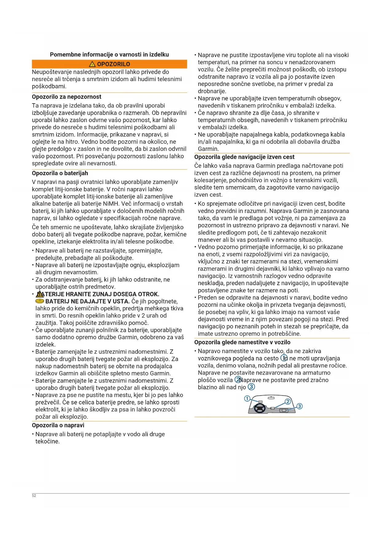 - Preden se odpravite na dejavnosti v naravi, bodite vedno pozorni na učinke okolja in privzeta tveganja dejavnosti, še posebej na vpliv, ki ga lahko imajo na varnost vaše dejavnosti vreme in z njim povezani pogoji na stezi. Pred navigacijo po neznanih poteh in stezah se prepričajte, da imate ustrezno opremo in potrebščine. Opozorila glede namestitve v vozilo