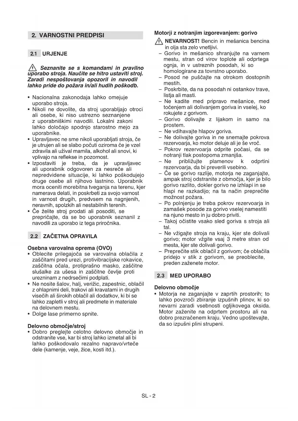 Priročnik je razčlenjen na poglavja in odstavke. Naslov odstavka „2.1 Urjenje“ je podnaslov naslova „2. Varnostni predpisi“. Sklici na naslove in odstavke so označeni z okrajšavama pogl. oziroma odst. in ustrezno številko. Na primer: „pogl. 2“ ali „odst. 2.1“. POZOR!: PREDEN UPORABITE STROJ, PAZLJIVO PREBERITE TA PRIROČNIK Z NAVODILI. Priročnik shranite za nadaljnjo uporabo.