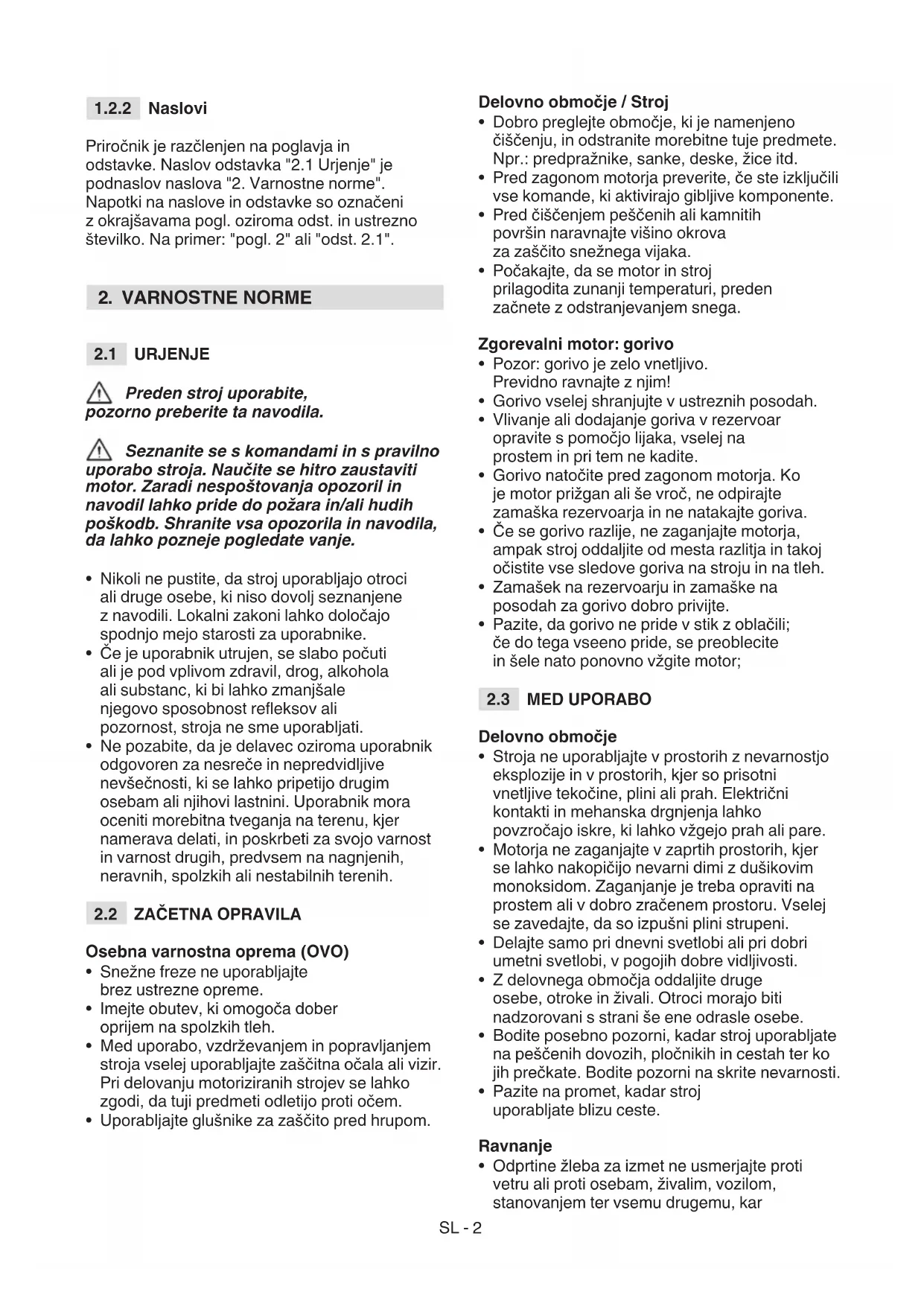 - Odprtine žleba za izmet ne usmerjajte proti vetru ali proti osebam, živalim, vozilom, stanovanjem ter vsemu drugemu, karSL - 3 bi lahko bilo poškodovano od snega ali v njem skritih predmetov. Ne dovolite, da bi se kdo zadrževal pred strojem.