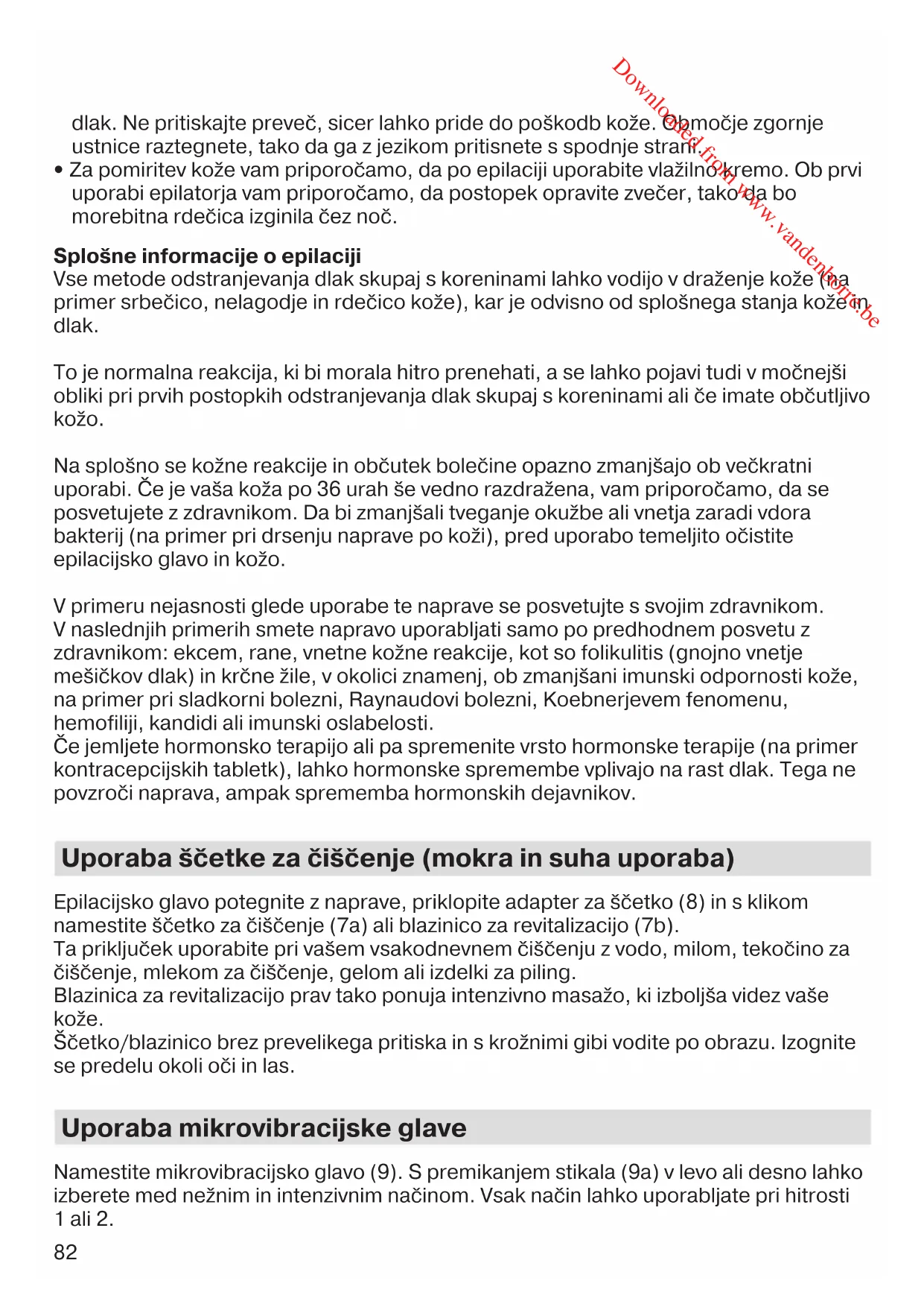 - Za pomiritev kože vam priporočamo, da po epilaciji uporabite vlažilno kremo. Ob prvi uporabi epilatorja vam priporočamo, da postopek opravite zvečer, tako da bo morebitna rdečica izginila čez noč. Splošne informacije o epilaciji Vse metode odstranjevanja dlak skupaj s koreninami lahko vodijo v draženje kože (na primer srbečico, nelagodje in rdečico kože), kar je odvisno od splošnega stanja kože in dlak. To je normalna reakcija, ki bi morala hitro prenehati, a se lahko pojavi tudi v močnejši obliki pri prvih postopkih odstranjevanja dlak skupaj s koreninami ali če imate občutljivo kožo. Na splošno se kožne reakcije in občutek bolečine opazno zmanjšajo ob večkratni uporabi. Če je vaša koža po 36 urah še vedno razdražena, vam priporočamo, da se posvetujete z zdravnikom. Da bi zmanjšali tveganje okužbe ali vnetja zaradi vdora bakterij (na primer pri drsenju naprave po koži), pred uporabo temeljito očistite epilacijsko glavo in kožo. V primeru nejasnosti glede uporabe te naprave se posvetujte s svojim zdravnikom. V naslednjih primerih smete napravo uporabljati samo po predhodnem posvetu z zdravnikom: ekcem, rane, vnetne kožne reakcije, kot so folikulitis (gnojno vnetje mešičkov dlak) in krčne žile, v okolici znamenj, ob zmanjšani imunski odpornosti kože, na primer pri sladkorni bolezni, Raynaudovi bolezni, Koebnerjevem fenomenu, hemofiliji, kandidi ali imunski oslabelosti. Če jemljete hormonsko terapijo ali pa spremenite vrsto hormonske terapije (na primer kontracepcijskih tabletk), lahko hormonske spremembe vplivajo na rast dlak. Tega ne povzroči naprava, ampak sprememba hormonskih dejavnikov. Uporaba ščetke za čiščenje (mokra in suha uporaba) Epilacijsko glavo potegnite z naprave, priklopite adapter za ščetko (8) in s klikom namestite ščetko za čiščenje (7a) ali blazinico za revitalizacijo (7b). Ta priključek uporabite pri vašem vsakodnevnem čiščenju z vodo, milom, tekočino za čiščenje, mlekom za čiščenje, gelom ali izdelki za piling. Blazinica za revitalizacijo prav tako ponuja intenzivno masažo, ki izboljša videz vaše kože. Ščetko/blazinico brez prevelikega pritiska in s krožnimi gibi vodite po obrazu. Izognite se predelu okoli oči in las. Uporaba mikrovibracijske glave Namestite mikrovibracijsko glavo (9). S premikanjem stikala (9a) v levo ali desno lahko izberete med nežnim in intenzivnim načinom. Vsak način lahko uporabljate pri hitrosti 1 ali 2. 91474612_FaceSpa_Pro_910-911-912-913_921_EURO_S4-122.indd 8291474612_FaceSpa_Pro_910-911-912-913_921_EURO_S4-122.indd 82 17.08.17 15:1517.08.17 15:15 CSS APPROVED Effective Date 18Aug2017 GMT - Printed 17Oct2017 Page 82 of 122 Downloaded from www.vandenborre.be83 Za nanos tekočih izdelkov za kožo priporočamo uporabo mikrovibracijske glave. Nežno trepljanje zagotavlja učinkovit in varčen nanos izdelka za nego kože. Mikrovibracijsko glavo počasi vodite po 3 območjih obraza (20 sekund na posameznem območju). Čiščenje in vzdrževanje Po uporabi očistite napravo na naslednji način: Mikrovibracijska glava (9): Za čiščenje uporabite vlažno krpo. Ne čistite jo z vodo. Epilacijska glava (2): S ščetko (10) previdno očistite pincete. Ščetko lahko pomočite v etanol (70%). Epilacijske glave ne čistite v vodi. Ščetka/blazinica za čiščenje/(7,8): Samo ta nastavek lahko čistite pod tekočo vodo. Če želite ščetko/blazinico (7a/b) temeljito očistiti z milom in toplo vodo, jo lahko odstranite, tako da pritisnete na gumb za sprostitev (8a). Po čiščenju se morajo vsi deli posušiti, preden jih spet priklopite. Za najboljše rezultate zamenjajte ščetko/blazinico (7a/b) vsake 3 mesece ali celo prej, če se ščetine obrabijo zaradi pogoste rabe. Različne nadomestne ščetke (ref. št. 80 Face) so na voljo pri vašem trgovcu, v Braunovem servisnem centru ali na spletnem mestu www.braun.com. Okoljsko opozorilo Izdelek vsebuje baterije in/ali električne odpadke, ki jih je mogoče reciklirati. Za zaščito okolja naprave ne odvrzite med gospodinjske odpadke, temveč jo odnesite na ustrezno zbirno mesto za recikliranje, ki je na voljo v vaši državi. Pridržujemo si pravico do sprememb brez predhodnega obvestila. Garancijski list Za izdelek velja dveletna garancija, ki začne veljati z datumom izročitve blaga. Proizvajalec jamči, da bo izdelek deloval v garancijskem roku ob pravilni uporabi v skladu z njegovim namenom in priloženimi navodili. V garancijski dobi bomo brezplačno odpravili vse okvare izdelka, ki so posledica napak v materialu ali izdelavi, tako da vam bomo izdelek po naši presoji popravili ali v celoti zamenjali. Če pooblaščeni servis vašega izdelka ne popravi v 45 dneh, imate pravico zahtevati nov izdelek. Za sprejem v reklamacijo se šteje dan, ko je izdelek sprejet v pooblaščeni servis, pri prodajalcu(distributerju) ali v trgovino, kjer ste izdelek kupili. Čas zagotavljanja servisa, vzdrževanja, nadomestnih delov in priklopnih aparatov je 3 leta po preteku garancijskega roka. Popravila na domu zaradi zahtevnosti in neprenosljivosti sodobne servisne opreme in razpoložljivosti rezervnih delov niso mogoča. Garancija velja na območju Republike Slovenije, pa tudi v vseh državah, kjer izdelek dobavlja podjetje Braun ali njegov pooblaščeni distributer. Garancija ne izključuje pravic potrošnika, ki izhajajo iz odgovornosti prodajalca za napake na blagu. 91474612_FaceSpa_Pro_910-911-912-913_921_EURO_S4-122.indd 8391474612_FaceSpa_Pro_910-911-912-913_921_EURO_S4-122.indd 83 17.08.17 15:1517.08.17 15:15 CSS APPROVED Effective Date 18Aug2017 GMT - Printed 17Oct2017 Page 83 of 122 Downloaded from www.vandenborre.be84 Garancija ne velja: – Za okvare, ki so posledica nepravilne uporabe, normalne obrabe ali rabe oziroma napake, ki imajo zanemarljiv učinek na vrednost in delovanje izdelka. – Ob vsakem posegu nepooblaščene osebe ali kakršnekoli druge predelave izdelka in če pri popravilu niso uporabljeni originalni