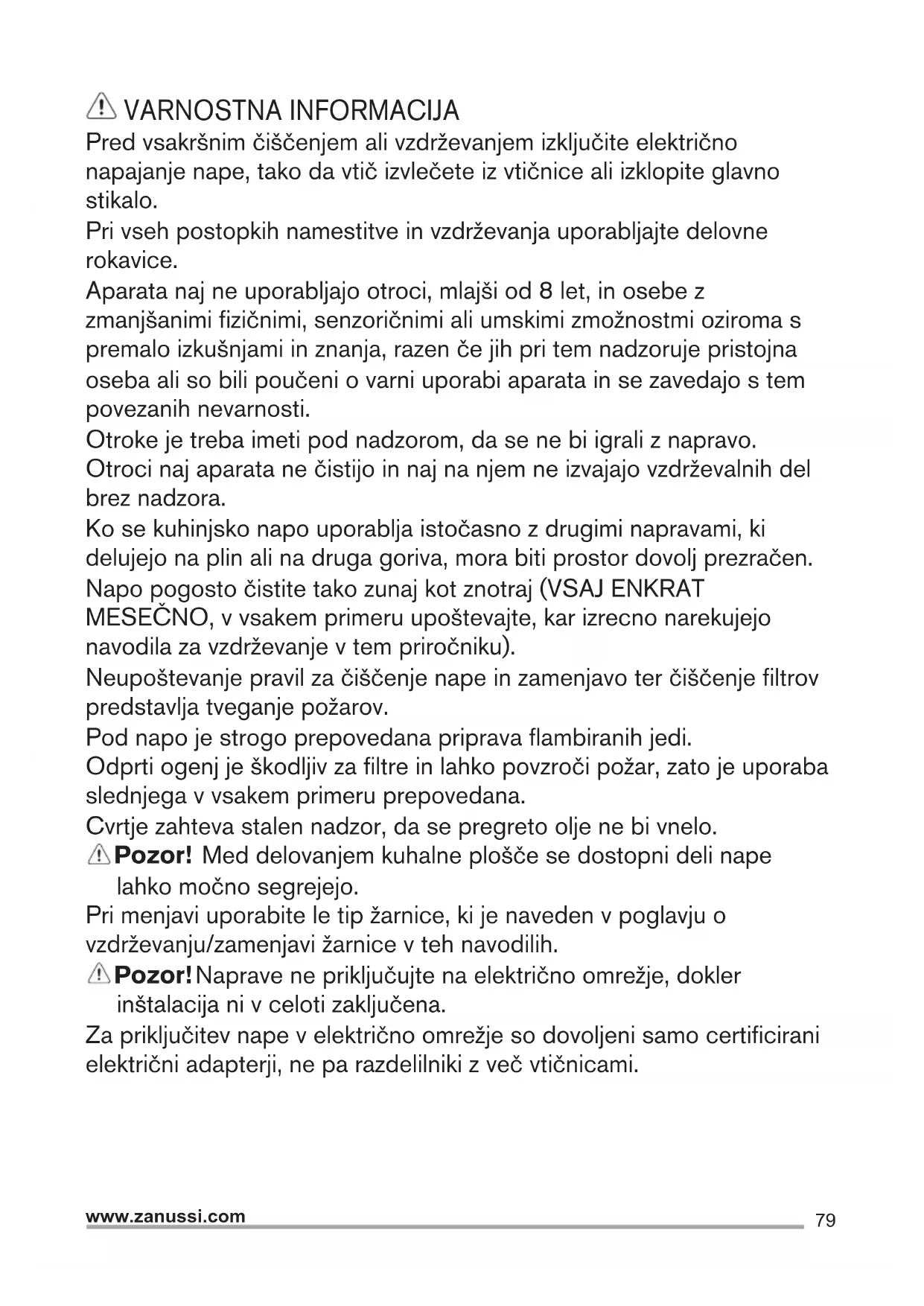 1 zapnutí/vypnutí osvětlení 2 vypnutí motoru 3 Minimální sací výkon 4 Středně vysoký sací výkon 5 Maximální sací výkon V případě velmi intenzivní koncentrace kuchyňských par použijte maximální sací výkon. Doporučuje se zapnout digestoř 5 minut před zahájením vaření a vypnout ji cca 15 minut po ukončení vaření. OSVĚTLENÍ Odpojte přístroj z elektrické sítě. Pozor! Dříve než se doktnete svítidel si ověřte že vychladla. Vyměňte poškozenou žárovku. Používejte pouze žárovky LED max. 3W E14. Další podrobnosti naleznete v přiloženém listu "ILCOS D" (alfanumerická pozice "1d").79 www.zanussi.com VARNOSTNA INFORMACIJA Pred vsakršnim čiščenjem ali vzdrževanjem izključite električno napajanje nape, tako da vtič izvlečete iz vtičnice ali izklopite glavno stikalo. Pri vseh postopkih namestitve in vzdrževanja uporabljajte delovne rokavice. Aparata naj ne uporabljajo otroci, mlajši od 8 let, in osebe z zmanjšanimi fizičnimi, senzoričnimi ali umskimi zmožnostmi oziroma s premalo izkušnjami in znanja, razen če jih pri tem nadzoruje pristojna oseba ali so bili poučeni o varni uporabi aparata in se zavedajo s tem povezanih nevarnosti. Otroke je treba imeti pod nadzorom, da se ne bi igrali z napravo. Otroci naj aparata ne čistijo in naj na njem ne izvajajo vzdrževalnih del brez nadzora. Ko se kuhinjsko napo uporablja istočasno z drugimi napravami, ki delujejo na plin ali na druga goriva, mora biti prostor dovolj prezračen. Napo pogosto čistite tako zunaj kot znotraj (VSAJ ENKRAT MESEČNO, v vsakem primeru upoštevajte, kar izrecno narekujejo navodila za vzdrževanje v tem priročniku). Neupoštevanje pravil za čiščenje nape in zamenjavo ter čiščenje filtrov predstavlja tveganje požarov. Pod napo je strogo prepovedana priprava flambiranih jedi. Odprti ogenj je škodljiv za filtre in lahko povzroči požar, zato je uporaba slednjega v vsakem primeru prepovedana. Cvrtje zahteva stalen nadzor, da se pregreto olje ne bi vnelo. Pozor! Med delovanjem kuhalne plošče se dostopni deli nape lahko močno segrejejo. Pri menjavi uporabite le tip žarnice, ki je naveden v poglavju o vzdrževanju/zamenjavi žarnice v teh navodilih. Pozor! Naprave ne priključujte na električno omrežje, dokler inštalacija ni v celoti zaključena. Za priključitev nape v električno omrežje so dovoljeni samo certificirani električni adapterji, ne pa razdelilniki z več vtičnicami.80 www.zanussi.com VARNOSTNA NAVODILA Kar zadeva tehnične in varnostne ukrepe za odvod dimov, morate strogo upoštevati določbe pristojnih krajevnih organov. Vsesani zrak se ne sme usmerjati v cevovod, ki služi kot odvod za pline, katere proizvajajo naprave, ki delujejo na plin ali druga goriva. Nape ne uporabljajte oziroma je ne puščajte z nepravilno nameščenimi žarnicami, saj obstaja tveganje električnega udara. Nape nikoli ne uporabljajte, če rešetka ni pravilno nameščena! Nape NIKOLI ne uporabljajte kot odlagalne površine, razen če je to izrecno dovoljeno. Za nameščanje izdelka uporabite le priložene pritrdilne vijake. Če jih ni na voljo, pa kupite pravo vrsto vijakov. Uporabite vijake prave dolžine, ki so navedeni v navodilih za namestitev. V primeru dvomov se posvetujte s pooblaščenim servisnim centrom ali s podobno usposobljeno osebo. POZOR! Če pri montaži vijakov in pritrdilnih elementov ne upoštevate teh navodil, obstaja nevarnost električnega udara.