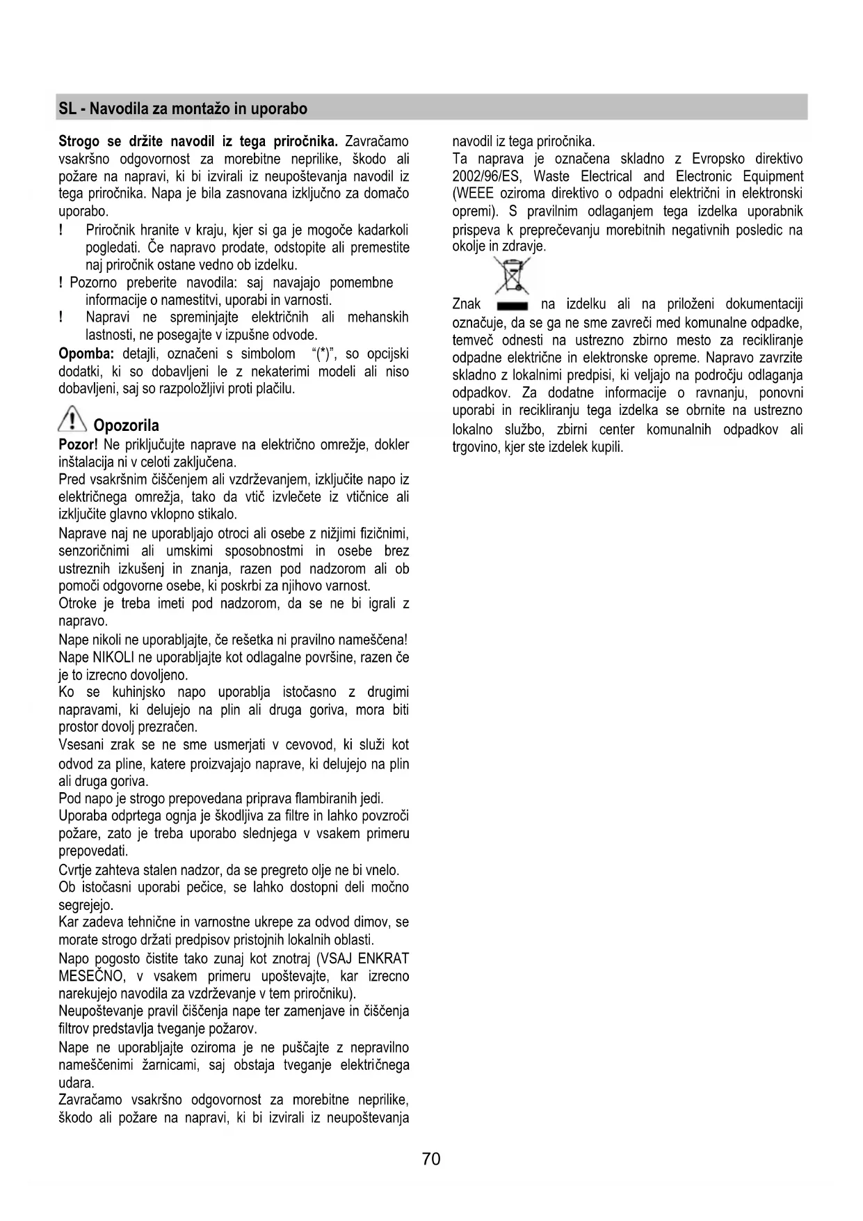 VAŠI SESALNI NAPI JE OSKRBLJENO Z MNOGOVRSTNIMI FUNKCIJAMI – ZNAČILNOSTI: - Funkcija on-off motora. Ko pritisnete na tipko št. 1, se požene ali se ugasne motor. Pri vžigu, napa stopi avtomatsko v dejavnost v tretji hitrosti. - 6 hitrosti. Hitrost, ki se pojavi na posebnem displayu, je mogoče izbrati s tipkama št. 2 in št. 3. - Funkcija timer. Služi za programirano ugašanje motora in luči po poteku 15 minut od dejavnosti funkcije, ki se požene če pritisnete na tipko št. 4. Kadar je timer v dejavnosti, na displayu se svetlika točka doli na desni strani. - Funkcija on-off luči. Ko pritisnete na tipko št. 5 se prižge ali se ugasne luč. - Posebne funkcije. Elektronsko upravljanje, ki je postavljeno v vaši sesalni napi je oskrbljeno z naprednimi funkcijami kot pomoč pri vzdrževanju in za pravilno uporabo izdelka. - Opozorilo pri nujnosti čiščenja kovinskih filterov. Vsakih 30 ur uporabe mikroprocesora, ki predstavlja srce sistema, na displayu se bo pojavila svetlikajoča črka “A” kot znak opozorila, da je nujno očistiti kovinske filtere proti maščobe. tako se jamči najboljše sesanje kakor tudi najboljša higijena okolja. Če želite izbrisati opozorilo potem ko ste že očistili filtere, morate povsem izključiti napu ter pritiskati na tipko št. 2 za več kot 5 sekund. Ko pritisnete na to tipko na displayu se bo prikazala črka “A”, katera se bo pa ugasnila po poteku 5 sekund, tako da bo mikroprocesor spet začel s štetjem sledečih 30 ur do novega opozorila. - Opozorilo pri nujnosti nadomeščanja karbon filterov (če so ti-le postavljeni). Ce uporabljate vašo sesalno napo z možnostjo filtriranja kar pomeni, da se izkoriščavajo karbon filteri za čiščenje vsesanega dima, najprej morate obvestiti mikroprocesor elektronkega sistema, ki vodi funkcijo filtriranja. v to namero, potem ko ste popolnoma izključili napo morate pritiskati na tipko št. 4 za več kot 5 sekund. Ko pritisnete na tole tipko na displayu se bo pokazal znak “-“ (kar pomeni, da napa ne uporablja karbon filter), kateri se bo nato spremenil v črko “C” po poteku 5 sekund (to pa pomeni, da napa koristi karbon filter). Od tega trenutka, vsakih 120 ur uporabe , mikroprocesor bo obvestil s svetlikajočo črko “C” na displayu, da je potrebno nadomestiti rabljen karbon filter. Tako se jamči najboljše sesanje ter najboljša higijena okolja. Če želite izbrisati opozorilo potem ko ste že nadomestili karbon filtere in povsem izključili napu, morate pritiskati na tipko št. 3 za več kot 5 sekund. Ko pritisnete na to tipko na displayu se bo pokazala črka “C” dočim bo ista izginila po poteku 5 sekund, tako da bo mikroprocesor ponovno začel s štetjem sledečih 120 ur do novega obvestila. Vzdrževanje Pozor! Pred vsakršnim čiščenjem ali vzdrževanjem izključite električno napajanje nape, tako da vtič izvlečete iz vtičnice ali izklopite glavno stikalo. Čiščenje Napa zahteva pogosto čiščenje, tako zunaj kot znotraj. Za čiščenje uporabljajte krpo, navlaženo s tekočimi nevtralnimi detergenti. Izogibajte se uporabi izdelkov, ki vsebujejo abrazivne snovi. NE UPOBLJAJTE ALKOHOLA! Pozor: Neupoštevanje pravil za čiščenje naprave in zamenjavo filtrov predstavlja tveganje požarov. Zato vam svetujemo, da sledite priporočenim navodilom. Zavračamo vsakršno odgovornost za morebitno škodo na motorju in požare, ki bi bili posledica neprimernega vzdrževanja ali neupoštevanja zgornjih opozoril. Maščobni filter - Sl. 12 Zaustavlja maščobne delce, ki nastajajo pri kuhanju. Očistiti ga je treba enkrat mesečno z ne agresivnimi čistilnimi sredstvi, ročno ali v pomivalnem stroju pri nizki temperaturi in kratkim ciklom pranja. S pranjem v pomivalnem stroju se maščobni filter lahko razbarva, toda njegove filtrirne značilnosti ostanejo nespremenjene. Ogleni filter (samo za obtočno različico) - Sl. 13 Zadržuje neprijetne vonjave, ki nastajajo pri kuhanju. Ogleni filter je potrebno zamenjati po daljši uporabi, glede na tip kuhe ter redno čiščenje maščobnega filtra. Vsekakor je potrebno zamenjati vložek najmanj vsake štiri mesece. Filter ni niti pralen niti obnovljiv. Zamenjava žarnic - Sl. 14 Izključite električno napajanje naprave. Pozor! Preden se žarnic dotaknete, se prepričajte, ali so hladne. Če luč ne bi delovala, preverite pravilno vstavitev žarnic v njihovo ležišče, preden se po pomoč obrnete na servisno službo.73 UK - Інструкція з монтажу і експлуатації Чітко дотримуватися приведених в даному керівництві інструкцій. Виробник знімає з себе всяку відповідальність за неполадки, збитки або пожар, що може мати місце при використанні прибору внаслідок невиконання інструкцій, приведених в даному керівництві. Витяжка призначена виключно для побутового використання. ! Важливо зберегти ці інструкції для того, щоб можна було звернутися до них в любий час. У випадку продажу, передачі чи переїзду, переконатися в тому щоб інструкції були разом з виробом. ! Уважно прочитати інструкції: В них міститься важлива інформація з встановлення, використання та