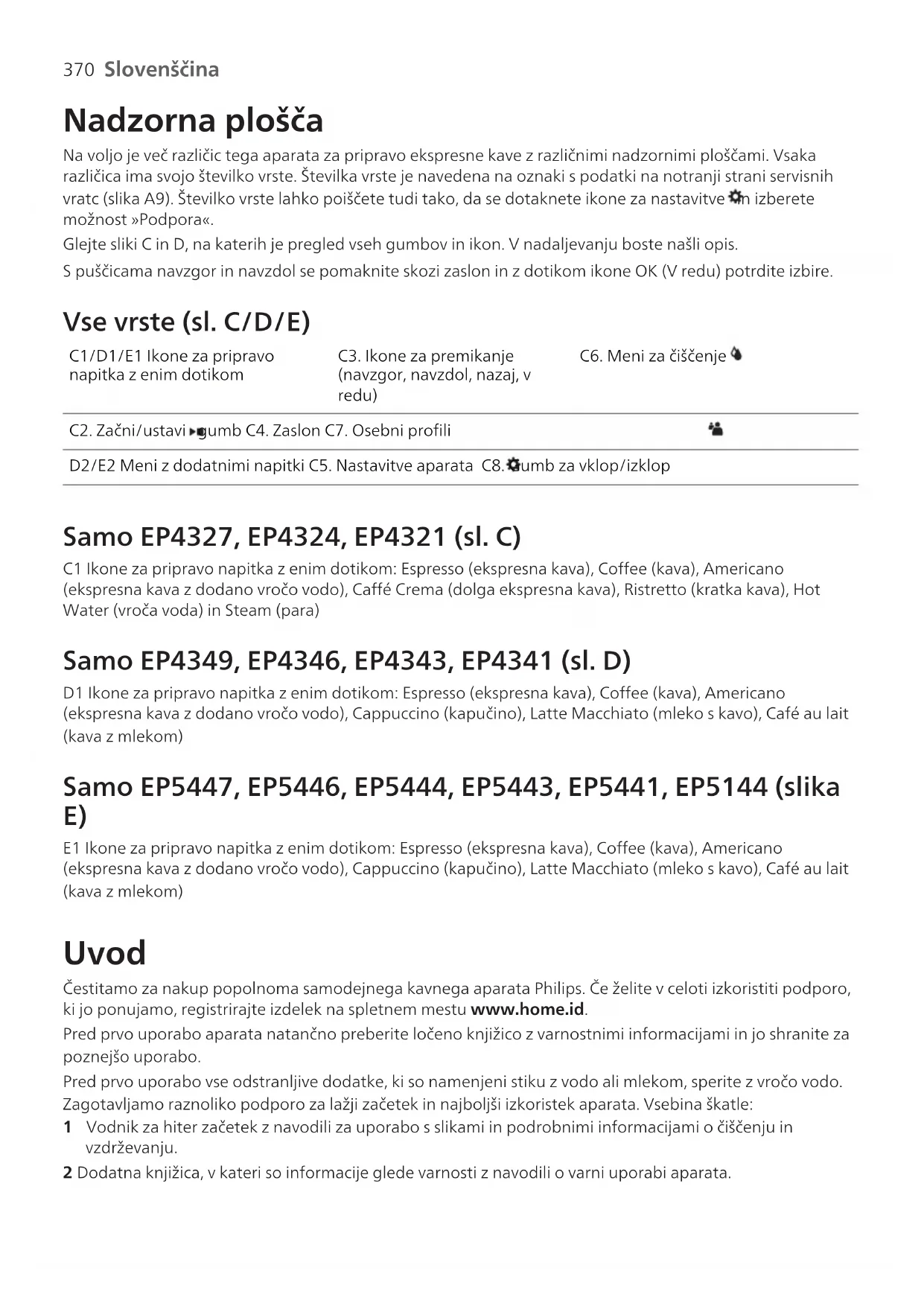 E1 Ikone za pripravo napitka z enim dotikom: Espresso (ekspresna kava), Coffee (kava), Americano (ekspresna kava z dodano vročo vodo), Cappuccino (kapučino), Latte Macchiato (mleko s kavo), Café au lait (kava z mlekom) Uvod Čestitamo za nakup popolnoma samodejnega kavnega aparata Philips. Če želite v celoti izkoristiti podporo, ki jo ponujamo, registrirajte izdelek na spletnem mestu www.home.id. Pred prvo uporabo aparata natančno preberite ločeno knjižico z varnostnimi informacijami in jo shranite za poznejšo uporabo. Pred prvo uporabo vse odstranljive dodatke, ki so namenjeni stiku z vodo ali mlekom, sperite z vročo vodo. Zagotavljamo raznoliko podporo za lažji začetek in najboljši izkoristek aparata. Vsebina škatle: 1 Vodnik za hiter začetek z navodili za uporabo s slikami in podrobnimi informacijami o čiščenju in vzdrževanju. 2 Dodatna knjižica, v kateri so informacije glede varnosti z navodili o varni uporabi aparata.371 Slovenščina Slovenščina 3 Za spletno podporo (razširjeno različico tega uporabniškega priročnika, pogosta vprašanja, videoposnetke ipd.) optično preberite kodo QR na platnici te knjižice, da prenesete aplikacijo HomeID, ali pa obiščite www.home.id/support. Kodo QR lahko poiščete tudi tako, da se dotaknete ikone za nastavitve in izberete možnost »Podpora«. Ta aparat je bil preskušen s kavo. Sicer je bil skrbno očiščen, vendar so lahko ponekod še ostanki kave. Kljub temu jamčimo, da je aparat popolnoma nov. Aparat samodejno prilagodi količino mlete kave, ki je potrebna za kavo najboljšega okusa. Najprej morate pripraviti pet kav, da bo aparat lahko izvedel samodejno nastavitev. Pred prvo uporabo izperite LatteGo (posodo za mleko) ali klasični penilnik mleka. Pred prvo uporabo