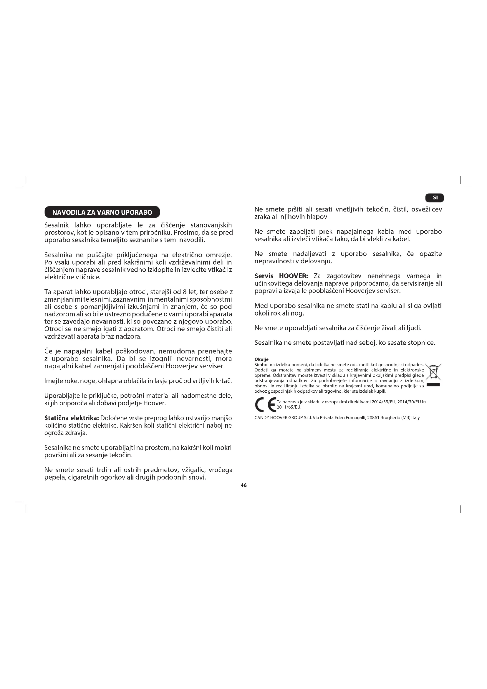 Sesalnik lahko uporabljate le za čiščenje stanovanjskih prostorov, kot je opisano v tem priročniku. Prosimo, da se pred uporabo sesalnika temeljito seznanite s temi navodili. Sesalnika ne puščajte priključenega na električno omrežje. Po vsaki uporabi ali pred kakršnimi koli vzdrževalnimi deli in čiščenjem naprave sesalnik vedno izklopite in izvlecite vtikač iz električne vtičnice. Ta aparat lahko uporabljajo otroci, starejši od 8 let, ter osebe z zmanjšanimi telesnimi, zaznavnimi in mentalnimi sposobnostmi ali osebe s pomanjkljivimi izkušnjami in znanjem, če so pod nadzorom ali so bile ustrezno podučene o varni uporabi aparata ter se zavedajo nevarnosti, ki so povezane z njegovo uporabo. Otroci se ne smejo igati z aparatom. Otroci ne smejo čistiti ali vzdrževati aparata braz nadzora. Če je napajalni kabel poškodovan, nemudoma prenehajte z uporabo sesalnika. Da bi se izognili nevarnosti, mora napajalni kabel zamenjati pooblaščeni Hooverjev serviser. Imejte roke, noge, ohlapna oblačila in lasje proč od vrtljivih krtač. Uporabljajte le priključke, potrošni material ali nadomestne dele, ki jih priporoča ali dobavi podjetje Hoover. Statična elektrika: Določene vrste preprog lahko ustvarijo manjšo količino statične elektrike. Kakršen koli statični električni naboj ne ogroža zdravja. Sesalnika ne smete uporabljajti na prostem, na kakršni koli mokri površini ali za sesanje tekočin. Ne smete sesati trdih ali ostrih predmetov, vžigalic, vročega pepela, cigaretnih ogorkov ali drugih podobnih snovi. Ne smete pršiti ali sesati vnetljivih tekočin, čistil, osvežilcev zraka ali njihovih hlapov Ne smete zapeljati prek napajalnega kabla med uporabo sesalnika ali izvleči vtikača tako, da bi vlekli za kabel. Ne smete nadaljevati z uporabo sesalnika, če opazite nepravilnosti v delovanju. Servis HOOVER: Za zagotovitev nenehnega varnega in učinkovitega delovanja naprave priporočamo, da servisiranje ali popravila izvaja le pooblaščeni Hooverjev serviser. Med uporabo sesalnika ne smete stati na kablu ali si ga ovijati okoli rok ali nog. Ne smete uporabljati sesalnika za čiščenje živali ali ljudi. Sesalnika ne smete postavljati nad seboj, ko sesate stopnice. Okolje Simbol na izdelku pomeni, da izdelka ne smete odstraniti kot gospodinjski odpadek. Oddati ga morate na zbirnem mestu za recikliranje električne in elektronske opreme. Odstranitev morate izvesti v skladu s krajevnimi okoljskimi predpisi glede odstranjevanja odpadkov. Za podrobneješe informacije o ravnanju z izdelkom, obnovi in recikliranju izdelka se obrnite na krajevni urad, komunalno podjetje za odvoz gospodinjskih odpadkov ali trgovino, kjer ste izdelek kupili. Ta naprava je v skladu z evropskimi direktivami 2014/35/EU, 2014/30/EU in 2011/65/EU. CANDY HOOVER GROUP S.r.l. Via Privata Eden Fumagalli, 20861 Brugherio (MB) Italy47