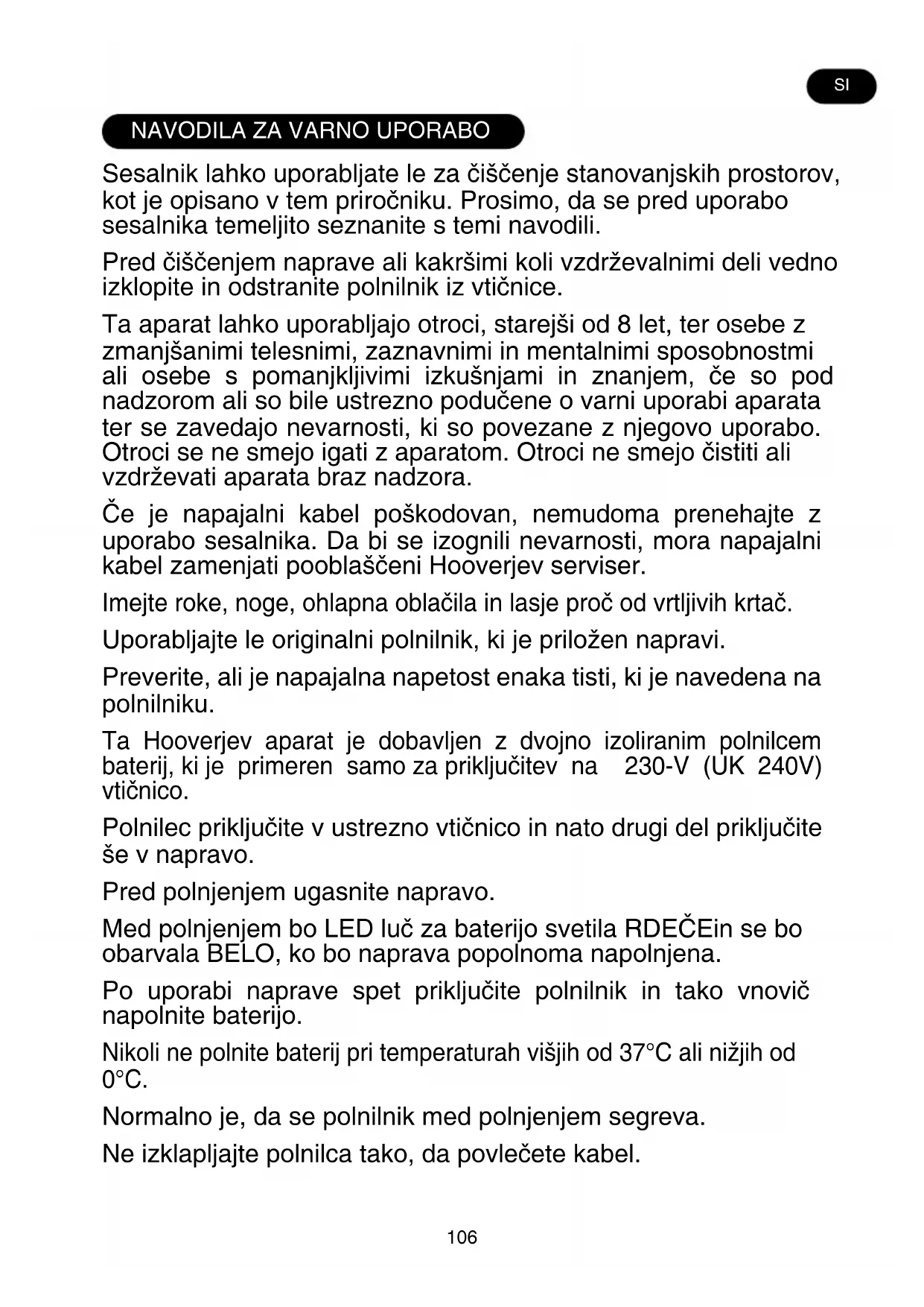 Sesalnik lahko uporabljate le za čiščenje stanovanjskih prostorov, kot je opisano v tem priročniku. Prosimo, da se pred uporabo sesalnika temeljito seznanite s temi navodili. Pred čiščenjem naprave ali kakršimi koli vzdrževalnimi deli vedno izklopite in odstranite polnilnik iz vtičnice. Ta aparat lahko uporabljajo otroci, starejši od 8 let, ter osebe z zmanjšanimi telesnimi, zaznavnimi in mentalnimi sposobnostmi ali osebe s pomanjkljivimi izkušnjami in znanjem, če so pod nadzorom ali so bile ustrezno podučene o varni uporabi aparata ter se zavedajo nevarnosti, ki so povezane z njegovo uporabo. Otroci se ne smejo igati z aparatom. Otroci ne smejo čistiti ali vzdrževati aparata braz nadzora. Če je napajalni kabel poškodovan, nemudoma prenehajte z uporabo sesalnika. Da bi se izognili nevarnosti, mora napajalni kabel zamenjati pooblaščeni Hooverjev serviser. Imejte roke, noge, ohlapna oblačila in lasje proč od vrtljivih krtač. Uporabljajte le originalni polnilnik, ki je priložen napravi. Preverite, ali je napajalna napetost enaka tisti, ki je navedena na polnilniku. Ta Hooverjev aparat je dobavljen z dvojno izoliranim polnilcem baterij, ki je primeren samo za priključitev na 230-V (UK 240V) vtičnico. Polnilec priključite v ustrezno vtičnico in nato drugi del priključite še v napravo. Pred polnjenjem ugasnite napravo. Med polnjenjem bo LED luč za baterijo svetila RDEČEin se bo obarvala BELO, ko bo naprava popolnoma napolnjena. Po uporabi naprave spet priključite polnilnik in tako vnovič napolnite baterijo. Nikoli ne polnite baterij pri temperaturah višjih od 37°C ali nižjih od 0°C. Normalno je, da se polnilnik med polnjenjem segreva. Ne izklapljajte polnilca tako, da povlečete kabel. SI107 Polnilec izklopite v primeru podaljšane odsotnosti (počitnice, itd.). Pred ponovno uporabo spet napolnite baterije, saj se lahko te izpraznijo samodejno, če sesalnika dlje časa ne uporabljate. Če boste napravo odvrgli, morate najprej odstraniti baterije. Ko želite odstraniti baterije, mora biti naprava izključena iz električnega toka. Baterije odvrzite na varen način. Pustite delovati napravo do konca, da bodo baterije popolnoma prazne. Uporabljene baterije je treba odnesti v enoto za recikliranje in se ne smejo odvreči v gospodinjske smeti. Za odstranitev baterij vas prosimo, da se obrnete na Hooverjev center za kupce ali nadaljujete po sledečih navodilih. POMEMBNO: Pred odstranjevanjem baterije vedno popolnoma izpraznite. Sesalnik naj deluje toliko časa, da se baterije do konca izpraznijo. Vtikač polnilca odstranite iz naprave. Pritisnite na gumbe za odstranitev baterije in jo odstranite tako, da jo potegnete vstran. Opomba: V primeru težav z razstavljanjem naprave ali za podrobnejše informacije o ravnanju z izdelkom, obnovi ali ricikliranju izdelka se obrnite na krajevni urad ali komunalno podjetje za odvoz gosodinjskih odpadkov. Uporabljajte le dodatke, potrošni material ali nadomestne dele, ki jih priporoča ali dobavi Hoover. Statična elektrika: določene vrste preprog lahko ustvarijo manjšo količino statične elektrike. Kakršen koli statični električni naboj ne ogroža zdravja. Sesalnika ne smete uporabljajti na prostem, na kakršni koli mokri površini ali za sesanje tekočin. Ne smete sesati trdih ali ostrih predmetov, vžigalic, vročega pepela, cigaretnih ogorkov ali drugih podobnih snovi. Ne smete pršiti ali sesati vnetljivih tekočin, čistil, osvežilcev zraka ali njihovih hlapov Ne smete zapeljati prek napajalnega kabla med uporabo sesalnika ali izvleči vtikača tako, da bi vlekli za kabel. Ne smete uporabljati naprave ali polnilnika, če ne delujeta pravilno. Hooverjev servis: Za zagotovitev nenehnega varnega in učinkovitega delovanja naprave priporočamo, da servis ali