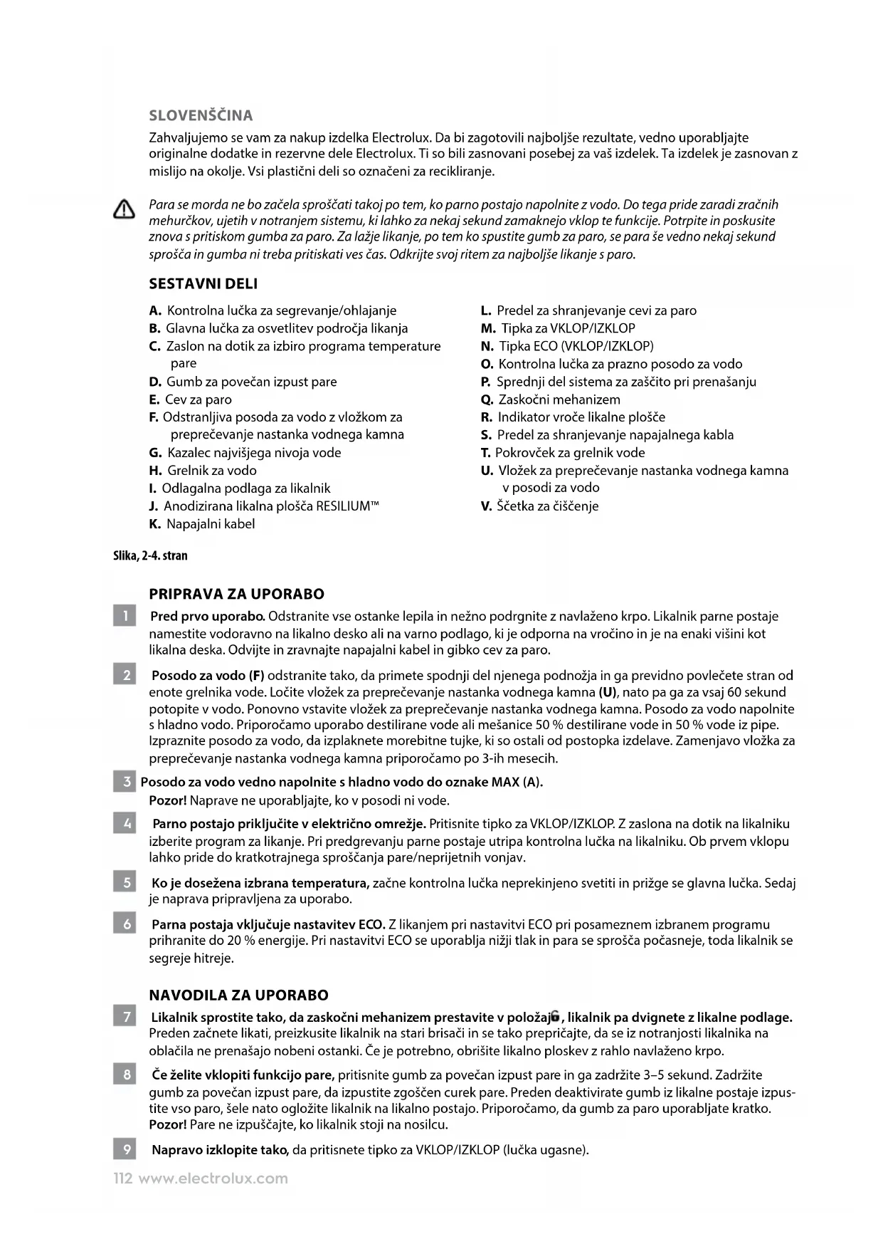 10 Preden likalnik shranite, ga pustite na odlagalni podlagi, da se popolnoma ohladi. Ko se likalnik ohladi, izpraznite posodo za vodo. Likalnik parne postaje shranite na odlagalni podlagi. 11 Ko naprave več ne uporabljate, jo izklopite s pritiskom na tipko za VKLOP/IZKLOP. Likalnik položite na odlagalno podlago, zaskočni mehanizem pa prestavite v položaj , da preprečite premikanje likalnika. 12 Napajalni kabel vedno shranite v predel za shranjevanje napajalnega kabla (S), gibko cev za paro pa v shran- jevalni del za cev za paro (L) na podstavku parne postaje. Opozorilo! NIKOLI ne ovijajte napajalnega kabla okrog likalnika. ČIŠČENJE 13 Podstavek postaje obrnite na stran, tako da je pokrovček grelnika vode na vrhu. Odvijte pokrovček grelnika vode. Stran z napravo obrnite nad umivalnikom in popolnoma izpraznite grelnik vode. 14 Pripravite vsaj 300 ml mešanice sredstva.(Za mešanico uporabite priporočeno razmerje. Če nastaja veliko vodnega kamna, ustrezno povečajte delež sredstva za odstranjevanje vodnega kamna.) Opomba: priporočamo uporabo Electroluxovega sredstva za odstranjevanje vodnega kamna EUD5. Upoštev- ajte navodila glede razmerja vode in sredstva za odstranjevanje vodnega kamna, ki so navedena na plastenki. Priporočamo, da izdelek očistite vsaka 2 meseca. 15 Izlijte mešanico. Grelnik za vodo napolnite s čisto vodo in jo nato izlijte. Ta korak ponovite večkrat, dokler ne odstranite vsega vodnega kamna in ni več vonja po sredstvu za odstranjevanje vodnega kamna. Pred ponovno sestavo v grelnik za vodo vrnite merico čiste vode. GARANCIJA NE KRIJE POŠKODBE, NASTALE KOT POSLEDICA MAŠENJA ZARADI VODNEGA KAMNA. Po konča- nem čiščenju pustite v grelniku za vodo nekaj vode (preden ga znova zaprete). 16 Ščetko za čiščenje vstavite v odprtino grelnika vode in očistite ostanke vode in vodnega kamna, pri čemer napravo držite nad umivalnikom. 17 Napravo očistite z rahlo navlaženo krpo. Pri odstranjevanju trdovratnih madežev lahko nanesete malo nea- brazivnega čistilnega sredstva. Uživajte z vašim novim Electrolux izdelkom! VARNOSTNI NASVETI Pred prvo uporabo naprave pozorno preberite navodila za uporabo.