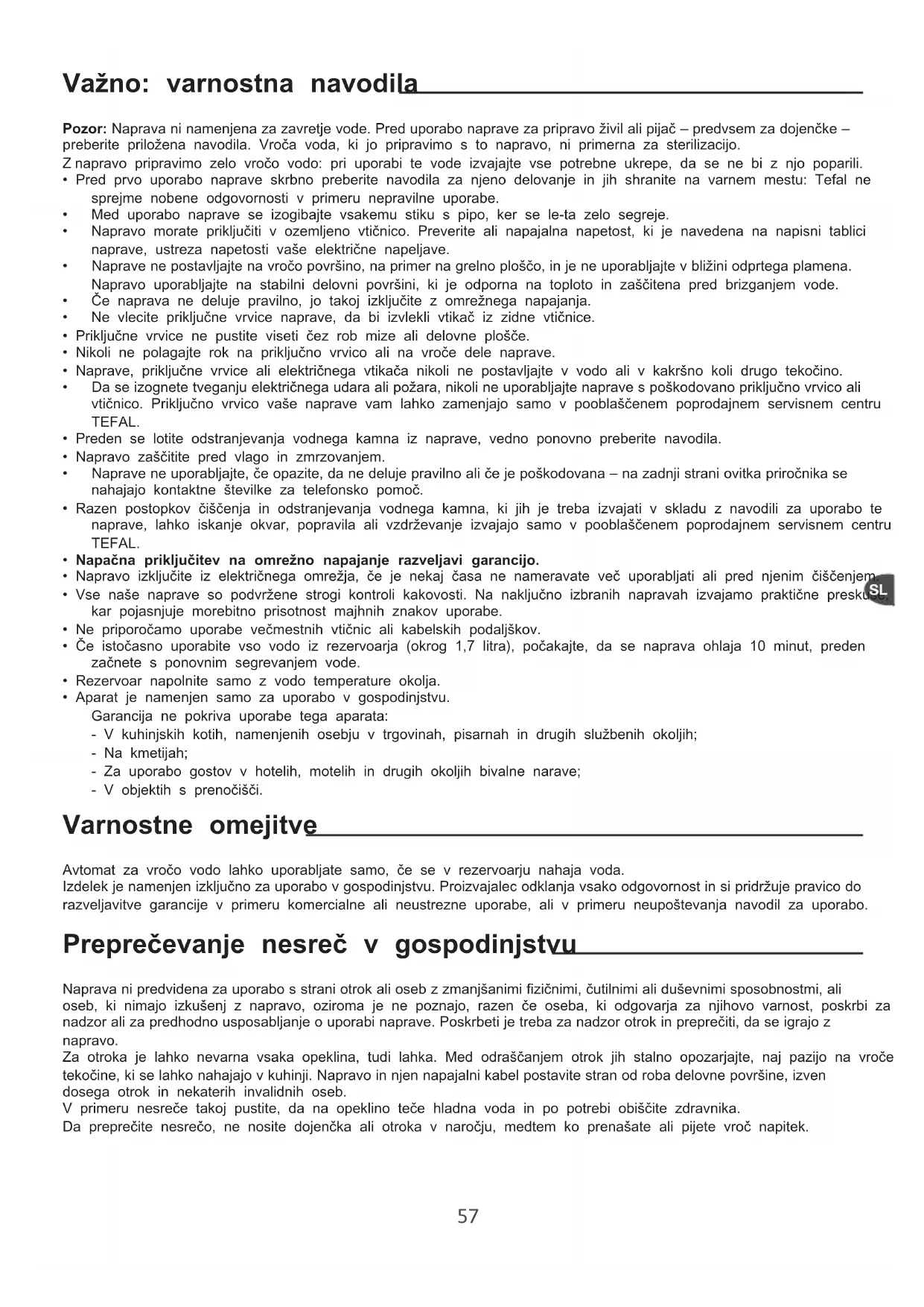 - Aparat je namenjen samo za uporabo v gospodinjstvu. Garancija ne pokriva uporabe tega aparata: - V kuhinjskih kotih, namenjenih osebju v trgovinah, pisarnah in drugih službenih okoljih; - Na kmetijah; - Za uporabo gostov v hotelih, motelih in drugih okoljih bivalne narave; - V objektih s prenočišči. Varnostne omejitve Avtomat za vročo vodo lahko uporabljate samo, če se v rezervoarju nahaja voda. Izdelek je namenjen izključno za uporabo v gospodinjstvu. Proizvajalec odklanja vsako odgovornost in si pridržuje pravico do razveljavitve garancije v primeru komercialne ali neustrezne uporabe, ali v primeru neupoštevanja navodil za uporabo. Preprečevanje nesreč v gospodinjstvu Naprava ni predvidena za uporabo s strani otrok ali oseb z zmanjšanimi fizičnimi, čutilnimi ali duševnimi sposobnostmi, ali oseb, ki nimajo izkušenj z napravo, oziroma je ne poznajo, razen če oseba, ki odgovarja za njihovo varnost, poskrbi za nadzor ali za predhodno usposabljanje o uporabi naprave. Poskrbeti je treba za nadzor otrok in preprečiti, da se igrajo z napravo. Za otroka je lahko nevarna vsaka opeklina, tudi lahka. Med odraščanjem otrok jih stalno opozarjajte, naj pazijo na vroče tekočine, ki se lahko nahajajo v kuhinji. Napravo in njen napajalni kabel postavite stran od roba delovne površine, izven dosega otrok in nekaterih invalidnih oseb. V primeru nesreče takoj pustite, da na opeklino teče hladna voda in po potrebi obiščite zdravnika. Da preprečite nesrečo, ne nosite dojenčka ali otroka v naročju, medtem ko prenašate ali pijete vroč napitek.