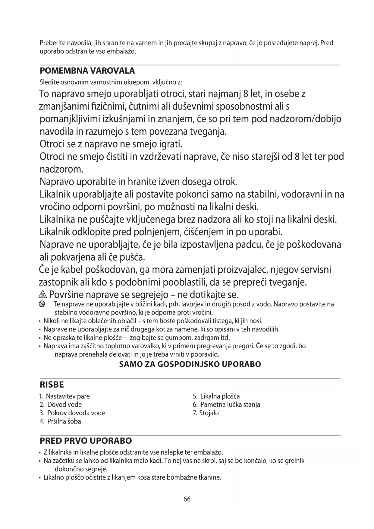 AE66 Preberite navodila, jih shranite na varnem in jih predajte skupaj z napravo, če jo posredujete naprej. Pred uporabo odstranite vso embalažo. POMEMBNA VAROVALA Sledite osnovnim varnostnim ukrepom, vključno z: To napravo smejo uporabljati otroci, stari najmanj 8 let, in osebe z zmanjšanimi zičnimi, čutnimi ali duševnimi sposobnostmi ali s pomanjkljivimi izkušnjami in znanjem, če so pri tem pod nadzorom/dobijo navodila in razumejo s tem povezana tveganja. Otroci se z napravo ne smejo igrati. Otroci ne smejo čistiti in vzdrževati naprave, če niso starejši od 8 let ter pod nadzorom. Napravo uporabite in hranite izven dosega otrok. Likalnik uporabljajte ali postavite pokonci samo na stabilni, vodoravni in na vročino odporni površini, po možnosti na likalni deski. Likalnika ne puščajte vključenega brez nadzora ali ko stoji na likalni deski. Likalnik odklopite pred polnjenjem, čiščenjem in po uporabi. Naprave ne uporabljajte, če je bila izpostavljena padcu, če je poškodovana ali pokvarjena ali če pušča. Če je kabel poškodovan, ga mora zamenjati proizvajalec, njegov servisni zastopnik ali kdo s podobnimi pooblastili, da se prepreči tveganje. h Površine naprave se segrejejo – ne dotikajte se. b Te naprave ne uporabljajte v bližini kadi, prh, lavorjev in drugih posod z vodo. Napravo postavite na stabilno vodoravno površino, ki je odporna proti vročini.