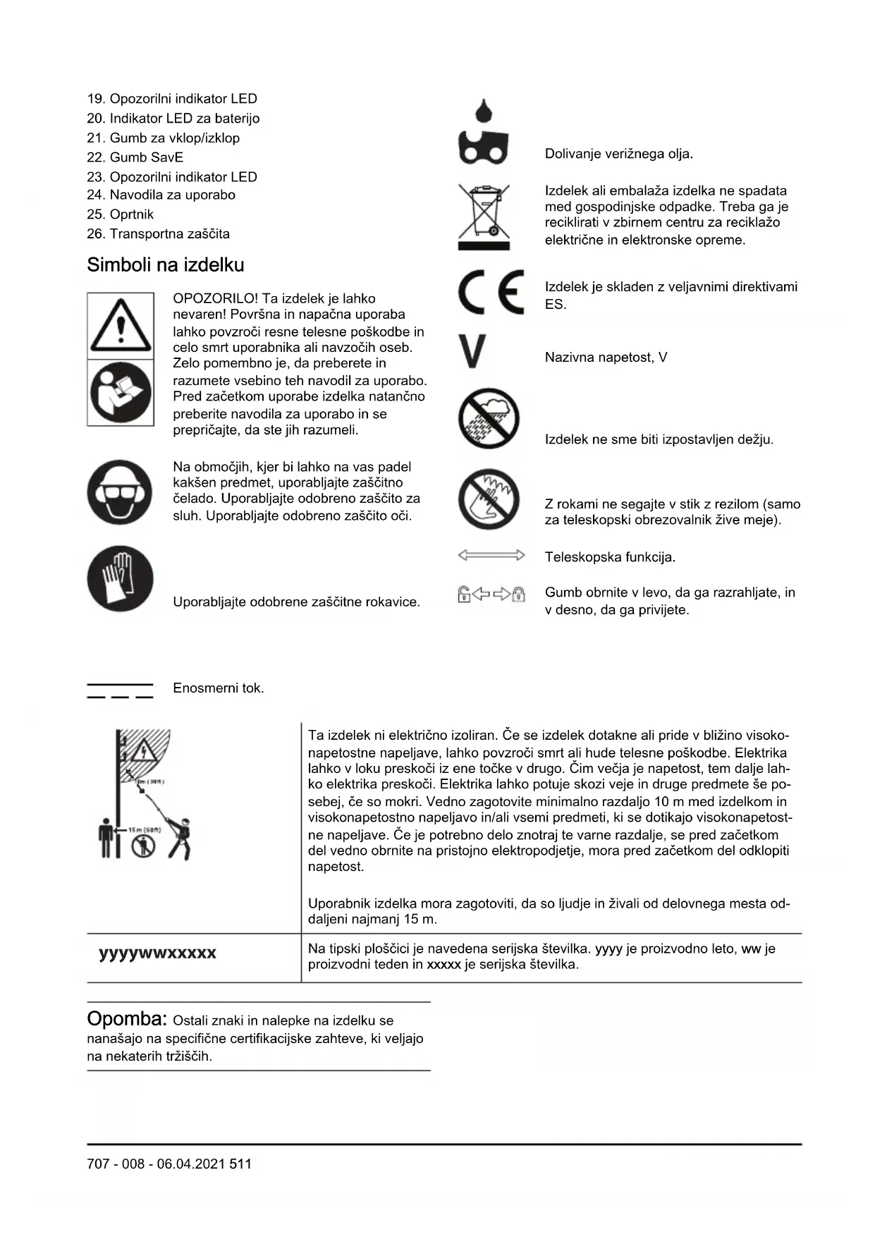 Simboli na izdelku OPOZORILO! Ta izdelek je lahko nevaren! Površna in napačna uporaba lahko povzroči resne telesne poškodbe in celo smrt uporabnika ali navzočih oseb. Zelo pomembno je, da preberete in razumete vsebino teh navodil za uporabo. Pred začetkom uporabe izdelka natančno preberite navodila za uporabo in se prepričajte, da ste jih razumeli. Na območjih, kjer bi lahko na vas padel kakšen predmet, uporabljajte zaščitno čelado. Uporabljajte odobreno zaščito za sluh. Uporabljajte odobreno zaščito oči. Uporabljajte odobrene zaščitne rokavice. Enosmerni tok. Dolivanje verižnega olja. Izdelek ali embalaža izdelka ne spadata med gospodinjske odpadke. Treba ga je reciklirati v zbirnem centru za reciklažo električne in elektronske opreme. Izdelek je skladen z veljavnimi direktivami ES. Nazivna napetost, V Izdelek ne sme biti izpostavljen dežju. Z rokami ne segajte v stik z rezilom (samo za teleskopski obrezovalnik žive meje). Teleskopska funkcija. Gumb obrnite v levo, da ga razrahljate, in v desno, da ga privijete. Ta izdelek ni električno izoliran. Če se izdelek dotakne ali pride v bližino visoko- napetostne napeljave, lahko povzroči smrt ali hude telesne poškodbe. Elektrika lahko v loku preskoči iz ene točke v drugo. Čim večja je napetost, tem dalje lah- ko elektrika preskoči. Elektrika lahko potuje skozi veje in druge predmete še po- sebej, če so mokri. Vedno zagotovite minimalno razdaljo 10 m med izdelkom in visokonapetostno napeljavo in/ali vsemi predmeti, ki se dotikajo visokonapetost- ne napeljave. Če je potrebno delo znotraj te varne razdalje, se pred začetkom del vedno obrnite na pristojno elektropodjetje, mora pred začetkom del odklopiti napetost. Uporabnik izdelka mora zagotoviti, da so ljudje in živali od delovnega mesta od- daljeni najmanj 15 m. yyyywwxxxxx Na tipski ploščici je navedena serijska številka. yyyy je proizvodno leto, ww je proizvodni teden in xxxxx je serijska številka. Opomba: Ostali znaki in nalepke na izdelku se nanašajo na specifične certifikacijske zahteve, ki veljajo na nekaterih tržiščih.