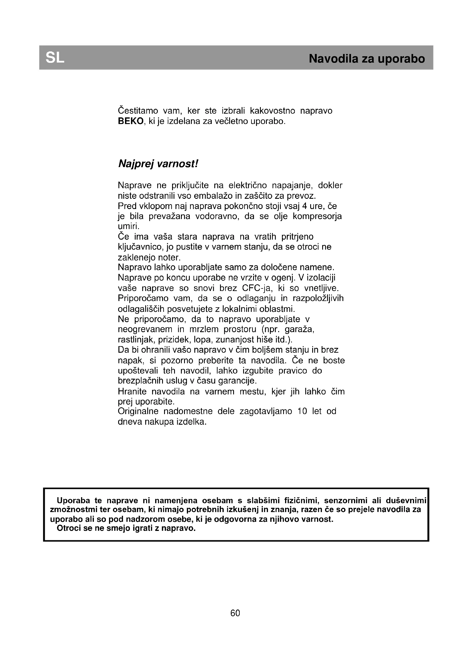 Najprej varnost! Naprave ne priključite na električno napajanje, dokler niste odstranili vso embalažo in zaščito za prevoz. Pred vklopom naj naprava pokončno stoji vsaj 4 ure, če je bila prevažana vodoravno, da se olje kompresorja umiri. Če ima vaša stara naprava na vratih pritrjeno ključavnico, jo pustite v varnem stanju, da se otroci ne zaklenejo noter. Napravo lahko uporabljate samo za določene namene. Naprave po koncu uporabe ne vrzite v ogenj. V izolaciji vaše naprave so snovi brez CFC-ja, ki so vnetljive. Priporočamo vam, da se o odlaganju in razpoložljivih odlagališčih posvetujete z lokalnimi oblastmi. Ne priporočamo, da to napravo uporabljate v neogrevanem in mrzlem prostoru (npr. garaža, rastlinjak, prizidek, lopa, zunanjost hiše itd.). Da bi ohranili vašo napravo v čim boljšem stanju in brez napak, si pozorno preberite ta navodila. Če ne boste upoštevali teh navodil, lahko izgubite pravico do brezplačnih uslug v času garancije. Hranite navodila na varnem mestu, kjer jih lahko čim prej uporabite. Originalne nadomestne dele zagotavljamo 10 let od dneva nakupa izdelka.