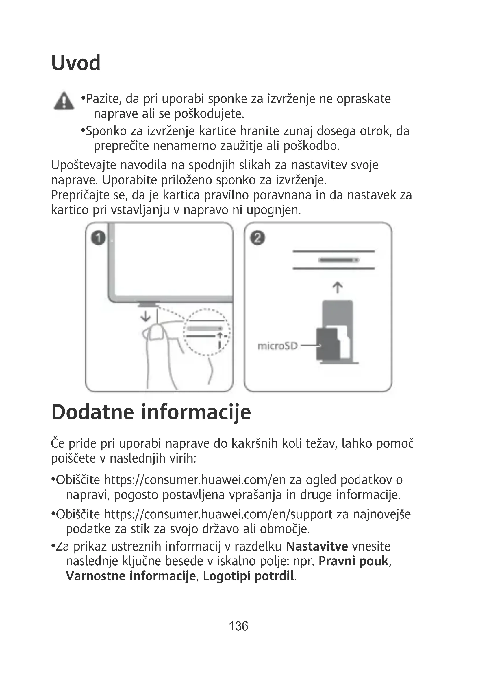 - Obiščite https://consumer.huawei.com/en/support za najnovejše podatke za stik za svojo državo ali območje.