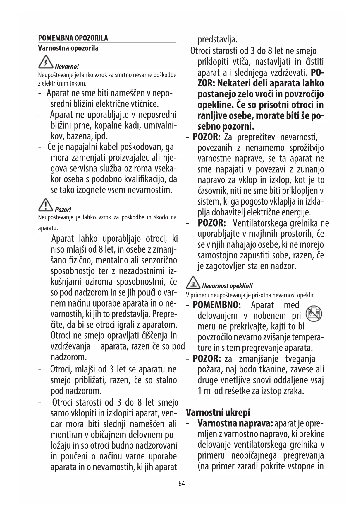VEN DOSEGA OTROK. - Zaužitje lahko povzroči hude poškod- be v manj kot 2 urah ali smrt. Zaradi kemičnih ožganin je možno predrtje požiralnika. - Preglejte naprave in se prepričajte, da je prostor baterije pravilno zaprt. Ne uporabljajte, če prostor baterije ni varen. - Rabljene gumbne baterije odstranite takoj in na varen način. Tudi prazne baterije so lahko nevarne. Temeljna opozorila o varnosti Spoštovani kupec - med delovanjem tega aparata se vtič segreje. To je povsem normalen pojav. To je OGREVALNA NAPRAVA VELIKE MOČI, skladna z našimi običajnimi visokimi standardi. Kljub temu vas prosimo, da preverite, ali so vaše stenske vtičnice v dobrem stanju in da je vtič pravilno vstavljen v vtičnico. S tem se izognete vsakemu nenamernemu pregrevanju.66 V kolikor aparata daljši čas ne nameravate uporabljati, vam svetujemo, da redno preverjate vtič in VTIČNICO ter se v primeru dvomov posvetujete z elektrikarjem. Samo za države izven EU: Uporabo aparata ne dovolite osebam (tudi otrokom) z zmanjšanimi psiho- zičnimi in senzoričnimi sposobnostmi ali z nezadostnim znanjem ter izkuš- njami, razen če jih pozorno nadzira ter pouči oseba, ki je odgovorna za njihovo varnost. Otroci naj bodo pod nadzorom, da jim preprečite igranje z aparatom. Odstranitev aparata Aparat ne smete odstraniti skupaj z gospodinjskimi odpadki, ampak ga morate izročiti pooblaščenemu centru za ločeno zbiranje odpad- kov.67 ВАЖНИ ПРЕДУПРЕЖДЕНИЯ Предупреждения за безопасност