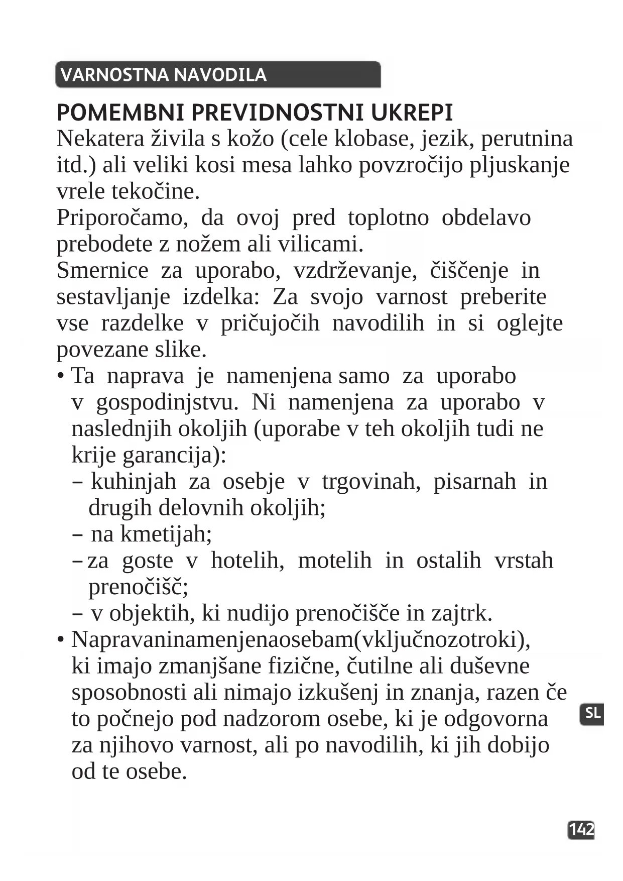 Nekatera živila s kožo (cele klobase, jezik, perutnina itd.) ali veliki kosi mesa lahko povzročijo pljuskanje vrele tekočine. Priporočamo, da ovoj pred toplotno obdelavo prebodete z nožem ali vilicami. Smernice za uporabo, vzdrževanje, čiščenje in sestavljanje izdelka: Za svojo varnost preberite vse razdelke v pričujočih navodilih in si oglejte povezane slike.