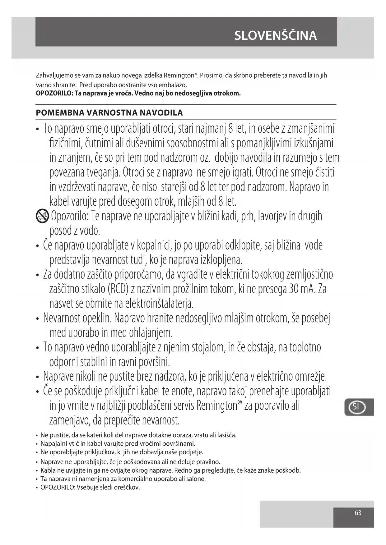 - Če se poškoduje priključni kabel te enote, napravo takoj prenehajte uporabljati in jo vrnite v najbližji pooblaščeni servis Remington® za popravilo ali zamenjavo, da preprečite nevarnost.