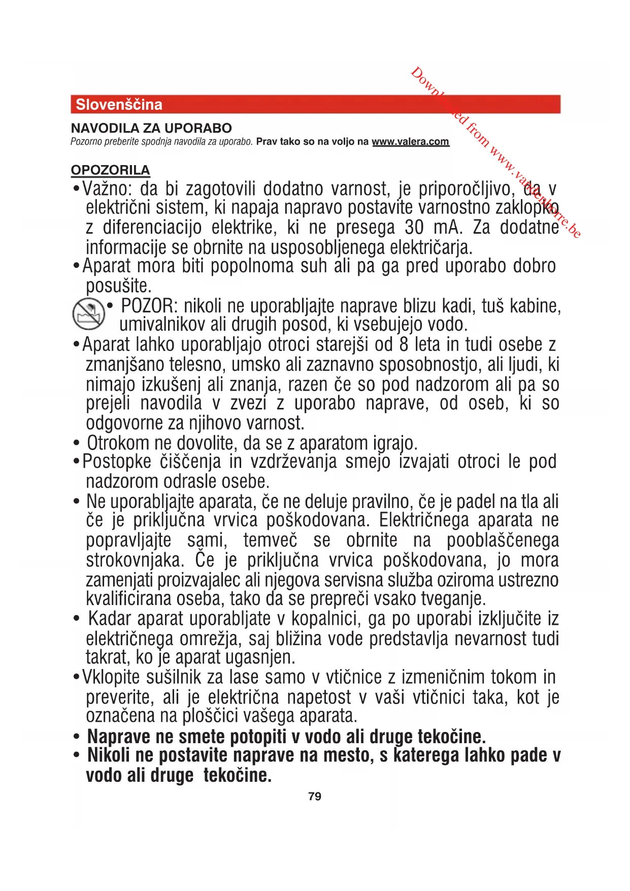 Pred čiščenjem vedno izklopite sušilnik za lase. Aparat čistite s krpo, ovlaženo v vodi. Naprave ne dajajte v vodo ali druge tekočine! Sušilec mora biti zaščiten pred prahom. Če je potrebno, očistite rešetke za vstop in izstop zraka z mehko ščetko. POZOR: Pri čiščenju sušilnika za lase je prepovedano uporabljati detergente, topila, alkohol in kemične izdelke. Valera je registrirana blagovna znamka podjetja Ligo Electric SA - Švica. 00060674_settembre 2014:Layout 1 09/09/2014 8.47 Pagina 81 Downloaded from www.vandenborre.be82 Slovenský