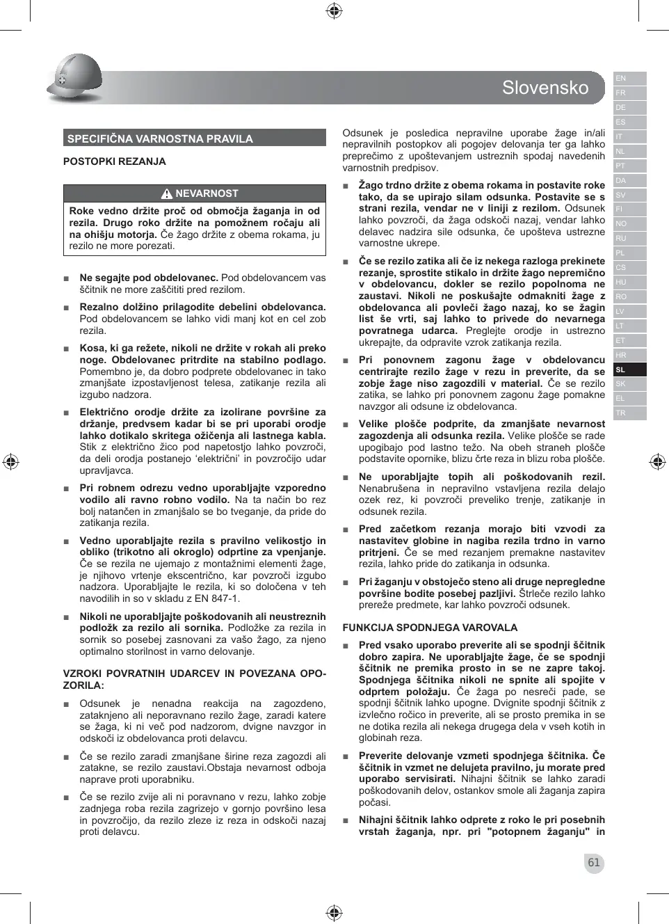 EN FR DE ES SPECIFIČNA VARNOSTNA PRAVILA POSTOPKI REZANJA NEVARNOST Odsunek je posledica nepravilne uporabe žage in/ali nepravilnih postopkov ali pogojev delovanja ter ga lahko preprečimo z upoštevanjem ustreznih spodaj navedenih varnostnih predpisov. ■