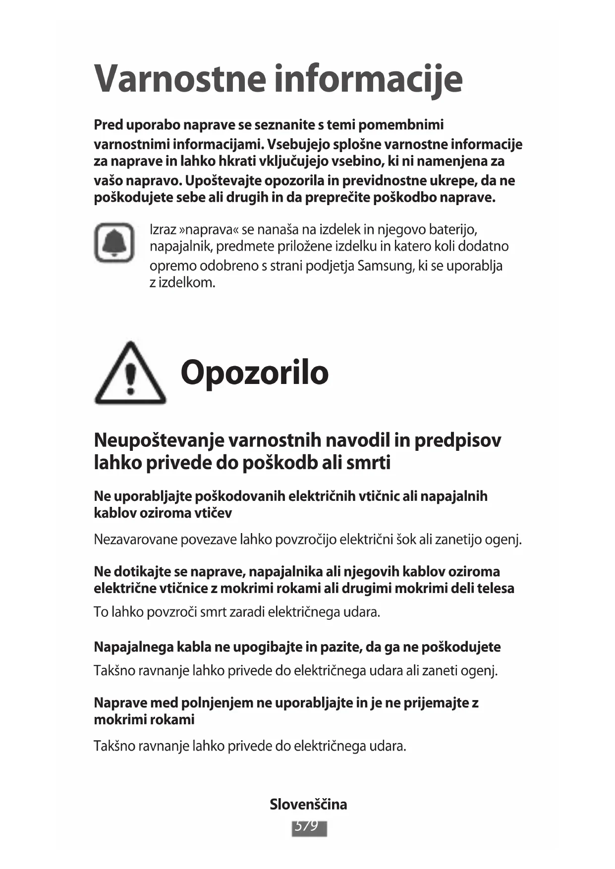 Varnostne informacije Pred uporabo naprave se seznanite s temi pomembnimi varnostnimi informacijami. Vsebujejo splošne varnostne informacije za naprave in lahko hkrati vključujejo vsebino, ki ni namenjena za vašo napravo. Upoštevajte opozorila in previdnostne ukrepe, da ne poškodujete sebe ali drugih in da preprečite poškodbo naprave. Izraz »naprava« se nanaša na izdelek in njegovo baterijo, napajalnik, predmete priložene izdelku in katero koli dodatno opremo odobreno s strani podjetja Samsung, ki se uporablja z izdelkom. Opozorilo Neupoštevanje varnostnih navodil in predpisov lahko privede do poškodb ali smrti Ne uporabljajte poškodovanih električnih vtičnic ali napajalnih kablov oziroma vtičev Nezavarovane povezave lahko povzročijo električni šok ali zanetijo ogenj. Ne dotikajte se naprave, napajalnika ali njegovih kablov oziroma električne vtičnice z mokrimi rokami ali drugimi mokrimi deli telesa To lahko povzroči smrt zaradi električnega udara. Napajalnega kabla ne upogibajte in pazite, da ga ne poškodujete Takšno ravnanje lahko privede do električnega udara ali zaneti ogenj. Naprave med polnjenjem ne uporabljajte in je ne prijemajte z mokrimi rokami Takšno ravnanje lahko privede do električnega udara.Slovenščina